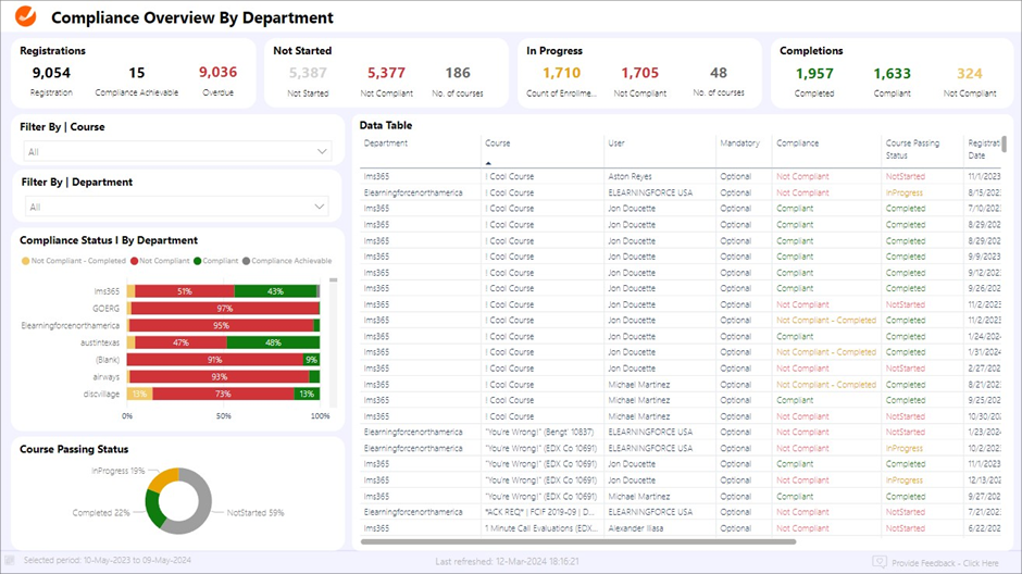 - Compliance | Nach Kurs. Schlüsselt die Compliancequoten innerhalb einzelner Kurse auf und offenbart, welche Kurse ein hohes Engagement und einen hohen Erfolg bei der Erfüllung der Compliancestandards aufweisen.