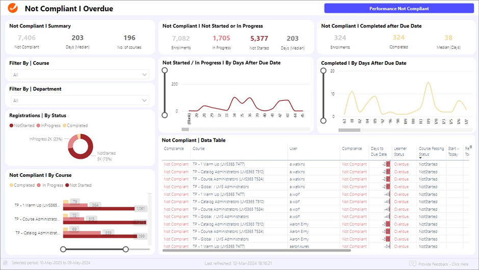 - Datentabelle „Nicht konform“ | Nach Lernenden. Bietet detaillierte Informationen zu jedem nicht konformen Kurs, einschließlich Kursname, Angaben zum Lernenden und wichtige Termine wie Anmelde- und Fälligkeitstermine. Diese Tabelle ist maßgeblich, um konkrete Fälle von Complianceverstößen zu erfassen und den Kontext jedes einzelnen Falls zu verstehen.