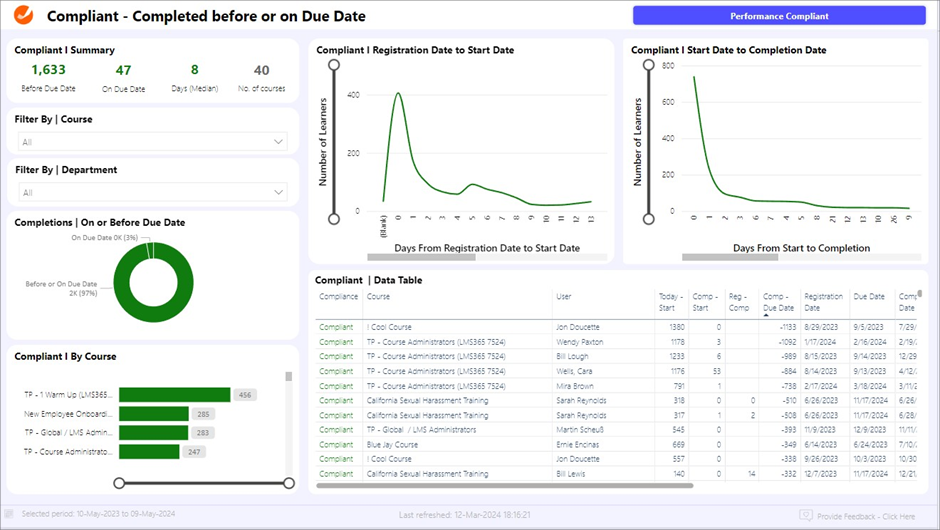 - Zusammenfassung zu konformen Kursen. Eine Momentaufnahme, die die Anzahl der Kurse zeigt, die vor, am oder bis zum Fälligkeitsdatum abgeschlossen wurden. Die Seite umfasst auch eine Berechnung des Medianwerts als Lagemaß, das ein Nachvollziehen des typischen Zeitrahmens für die Fertigstellung ermöglicht.