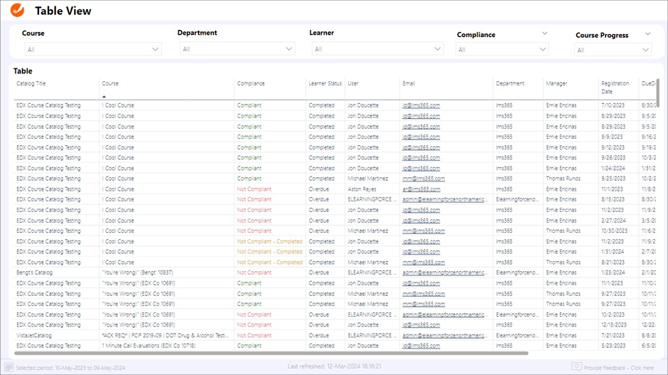 Die Seite „Tabellensicht“ bietet eine detaillierte tabellarische Übersicht über alle Kursanmeldungen, Abschlüsse und Compliancestatus in der gesamten Organisation. Diese vielseitige Ressource ist besonders wertvoll für Administratoren und Manager, die bestimmte Datenpunkte eingehend analysieren, den Fortschritt einzelner Lernender kontrollieren und die Compliance differenziert überwachen müssen.