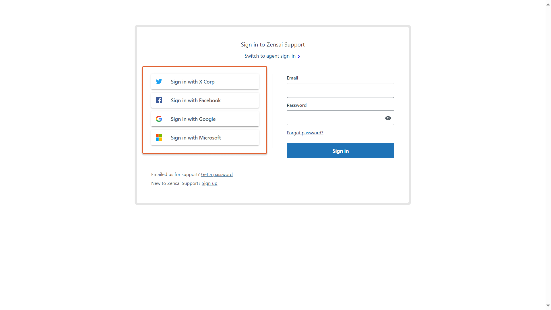 Sie werden zur Anmeldeseite des ausgewählten Kontos weitergeleitet. Geben Sie dort Ihre Anmeldeinformationen ein. Sofern Ihre Zugangsdaten gültig sind, wird ein Benutzerprofil im Zensai-Hilfecenter erstellt, und Sie werden angemeldet. Die Schaltfläche Anfrage einreichen wird aktiviert.