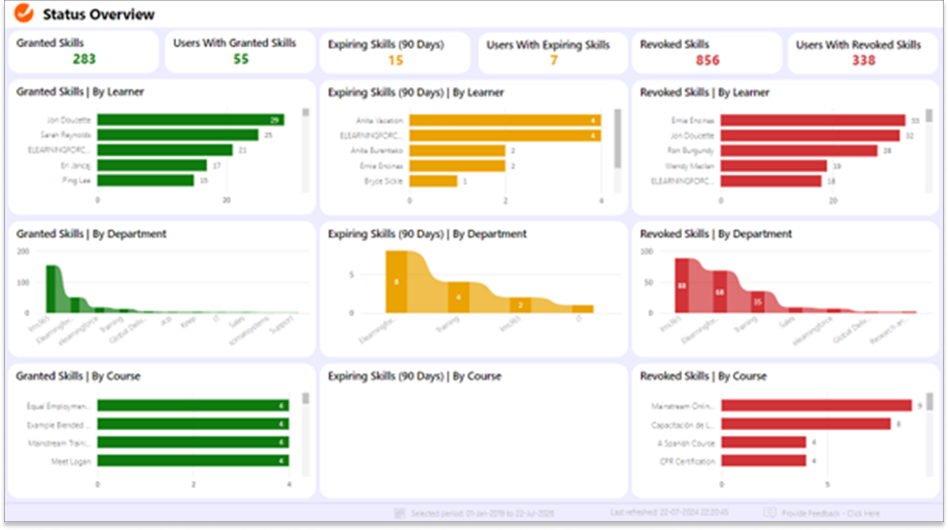Die Daten sind nach zentralen Faktoren wie Lernende, Abteilung und Kurs segmentiert, um Stakeholdern ein umfassendes Verständnis von Qualifikationsverteilung und -fortschritt in der gesamten Organisation zu vermitteln. Durch die Veranschaulichung dieser Kategorien in einem niederschwelligen Format erlaubt die Seite es Entscheidungsträgern, die Kompetenzen der Belegschaft auf einen Blick zu erfassen, Trends zu erkennen und strategische Schulungsinitiativen zu entwickeln, die darauf abzielen, Lücken zu schließen und das Wachstum des Unternehmens aufrechtzuerhalten.