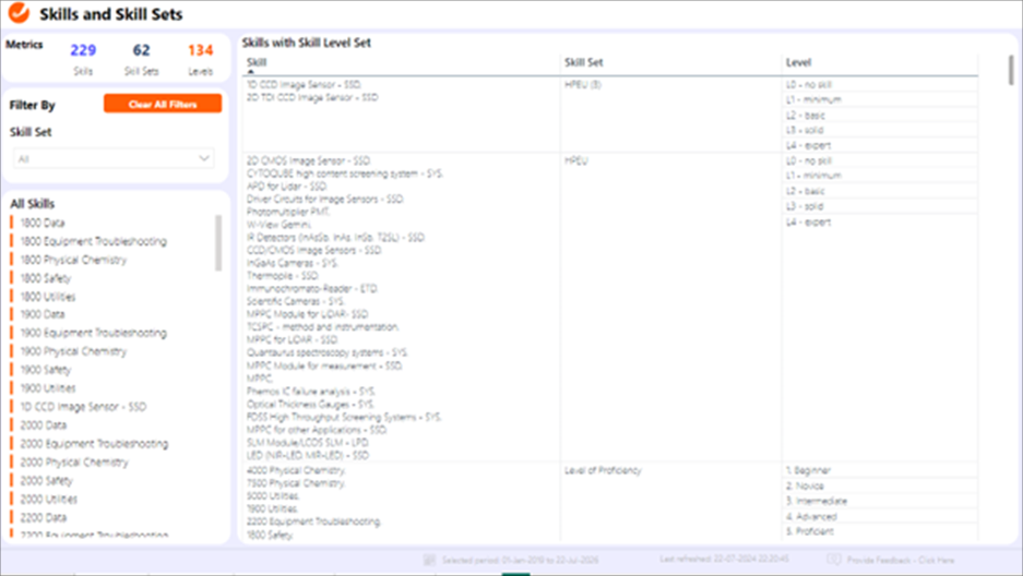 Diese Seite enthält benutzerfreundliche Filter, die eine präzise Auswertung der Daten ermöglichen. Benutzer können die verfügbaren Qualifikationen nach konkreten Qualifikationsgruppen filtern. Dies ermöglicht eine zielgerichtete Analyse, bei der nur die relevantesten Qualifikationen und Kompetenzstufen berücksichtigt werden. Diese Filter sorgen dafür, dass die Benutzer genau die Informationen einsehen können, die sie für die strategische Planung benötigen, z. B. um festzustellen, welche Qualifikationen in bestimmten Abteilungen fehlen oder in welchen Bereichen das Kompetenzniveau weiter verbessert werden muss. Dank der dynamischen Struktur dieser Seite werden alle Visualisierungen bei Anwendung von Filtern automatisch aktualisiert, sodass relevante Einblicke, die auf die Bedürfnisse der Benutzer zugeschnitten sind, in Echtzeit bereitgestellt werden.