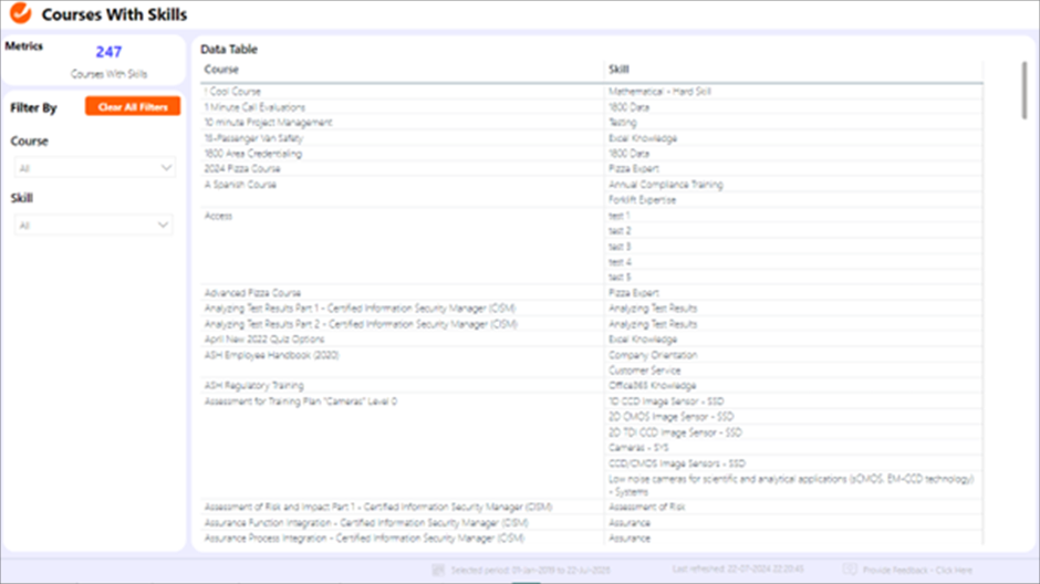 Datentabelle für Kursqualifikationen Diese zentrale Visualisierung listet alle verfügbaren Kurse zusammen mit den von ihnen unterstützten Qualifikationen auf. Die Tabelle enthält Details wie Kurstitel, zugehörige Qualifikationen und Qualifikationskategorien. Diese detaillierte Übersicht hilft den Stakeholdern zu verstehen, welche Kurse für die Erlangung bestimmter Qualifikationen essenziell sind, und erleichtert so die Gestaltung von Lernpfaden passend zu bestimmten strategischen Zielen.