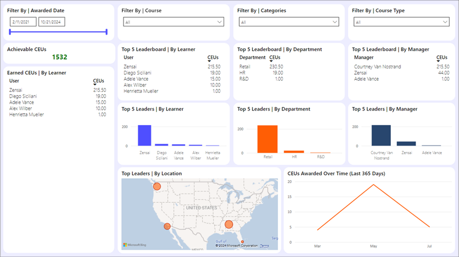 Mithilfe dieser Analysen können Unternehmen ganz einfach ihre leistungsstärksten Lernenden und Abteilungen ermitteln, deren Erfolge würdigen und diese Daten für die Gestaltung zukünftiger Schulungs- und Fortentwicklungsstrategien nutzen. Die Seite „Bestenliste“ bietet außerdem die Möglichkeit, die geografische Verteilung der WBE-Erfolge zu erfassen, um sicherzustellen, dass alle Regionen angemessen unterstützt und eingebunden werden. Darüber hinaus hilft das WBE-Tracking über einen längeren Zeitraum hinweg Unternehmen dabei, Trends zu erkennen, wie z. B. saisonale Schwankungen beim Engagement oder Auswirkungen bestimmter Schulungsinitiativen, die als Grundlage für die strategische Planung und Ressourcenzuweisung dienen können.