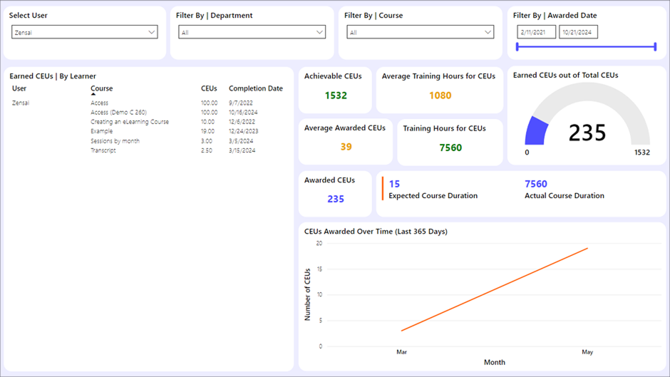 - Nach Benutzer. Die Seite „Nach Benutzer“ zeigt eine detaillierte Aufschlüsselung der von einzelnen Benutzern erworbenen WBEs. Sie stellt kursspezifische Leistungen, die durchschnittliche Schulungsdauer und den WBE-Fortschritt dar.