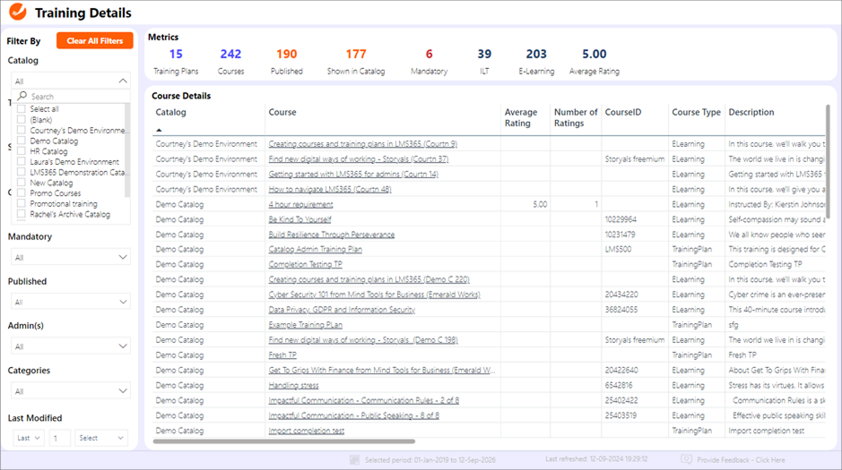 Kürzlich geänderte Kurse ermitteln. Mithilfe des Filters „Zuletzt geändert am“ und der Spalten der Datentabelle können Administratoren rasch Kurse identifizieren, die erst kürzlich aktualisiert wurden. Dies ist besonders nützlich, um sicherzustellen, dass die Lernenden Zugang zu aktuellsten Schulungsmaterialien haben, und um Prüfzyklen zu priorisieren.