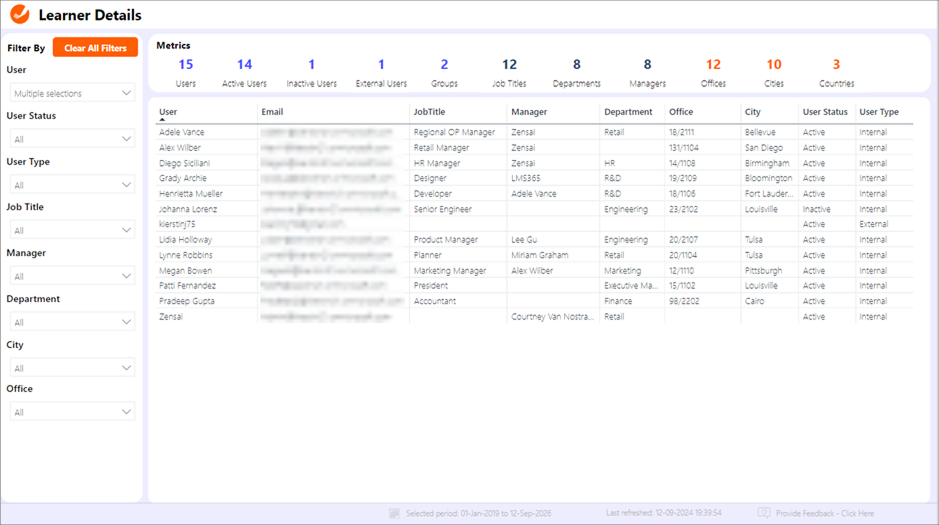 Demografie der Lernenden einsehen. Verschaffen Sie sich ein umfassendes Bild von den Lernenden, indem Sie ihre Verteilung auf Positionen, Abteilungen, Büros und Orte analysieren. Diese Angaben tragen dazu bei, dass Schulungsprogramme alle Berufsgruppen einbeziehen und für sie relevant sind.