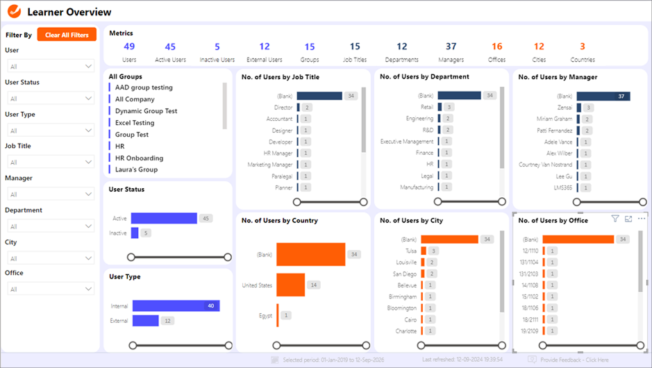 Geographische Verteilung (Benutzer nach Land, Ort und Büro). Mehrere Visualisierungen, die die Verteilung der Lernenden auf verschiedene geografische Standorte anzeigen. Mithilfe dieser Visuals können Unternehmen ihren globalen Lernbedarf ermitteln und regionale Schulungsinitiativen planen.
