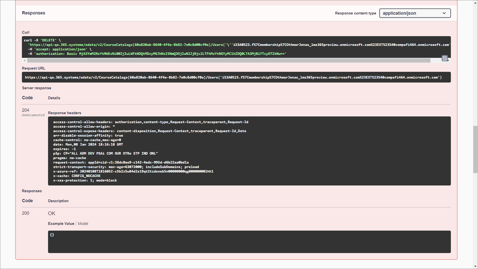 - Im Feld Response body werden die Ergebnisse der Anfrage angezeigt. Der Benutzer bzw. die Gruppe wird aus dem Kurskatalog und aus der zugehörigen Liste Benutzer gelöscht und von allen Kursen und Schulungsplänen dieses Kurskatalogs abgemeldet.