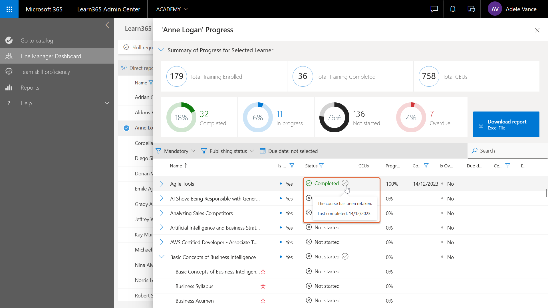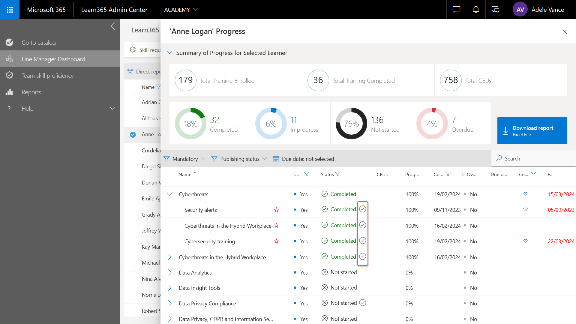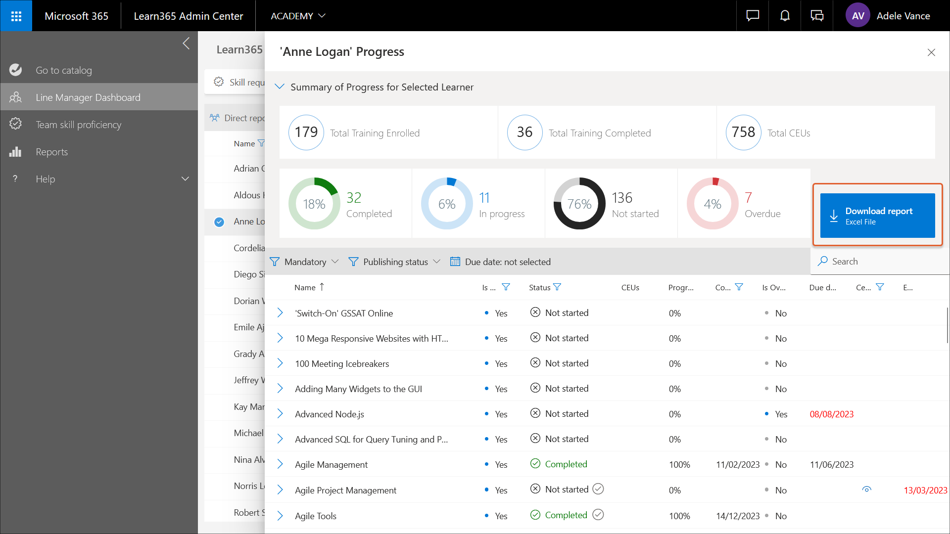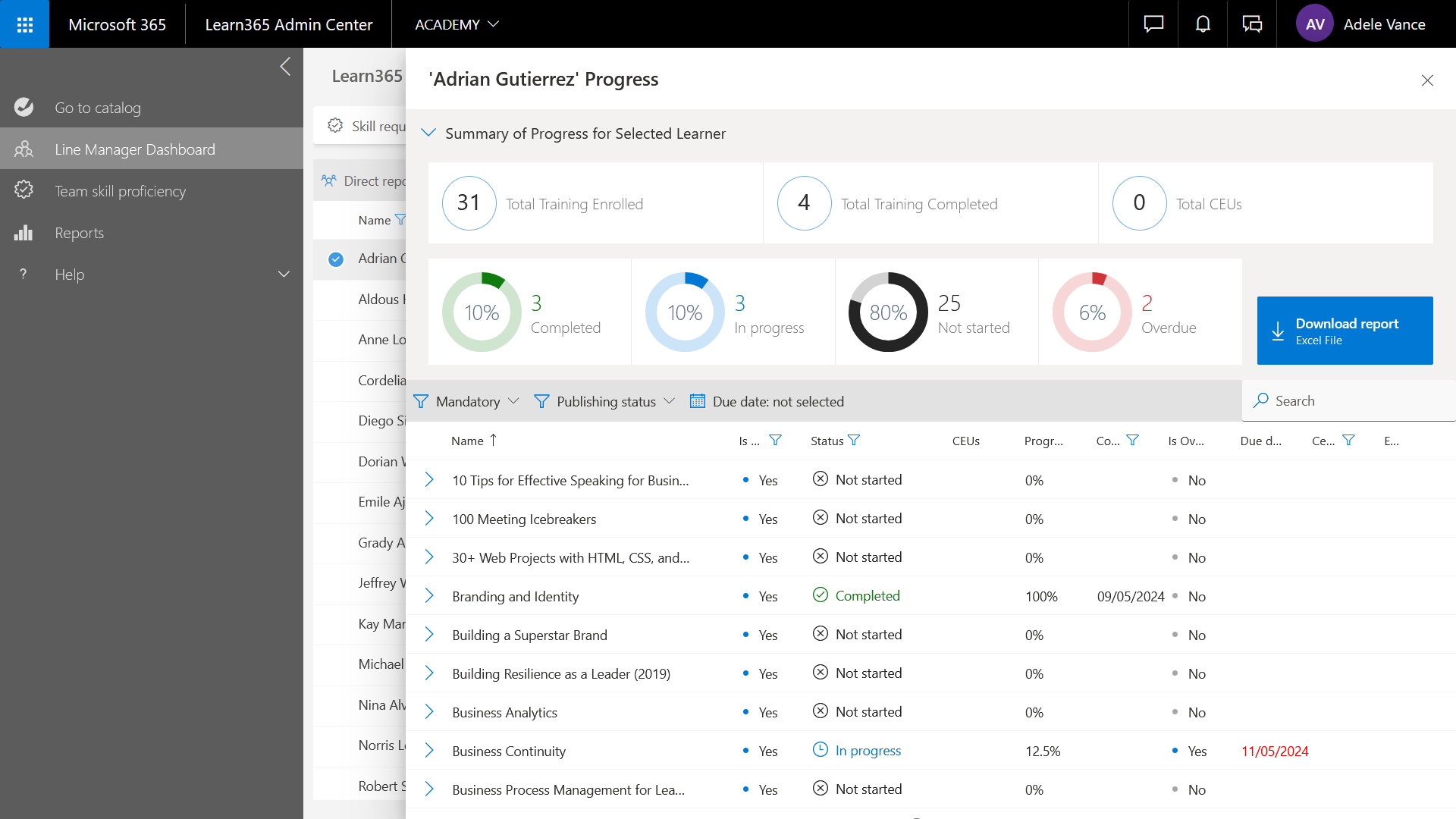 Zum Herunterladen des Berichts „Fortschritt des Lernenden“ im Excel-Format klickt der Linienmanager auf Bericht herunterladen.