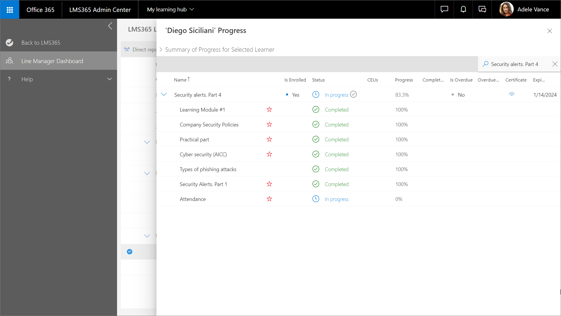 Über das Linienmanager-Dashboard können Linienmanager den Fortschritt ihres Teams bei Schulungsaktivitäten in voller Detailtiefe einsehen und den Fortschritt jedes Teammitglieds nachvollziehen.