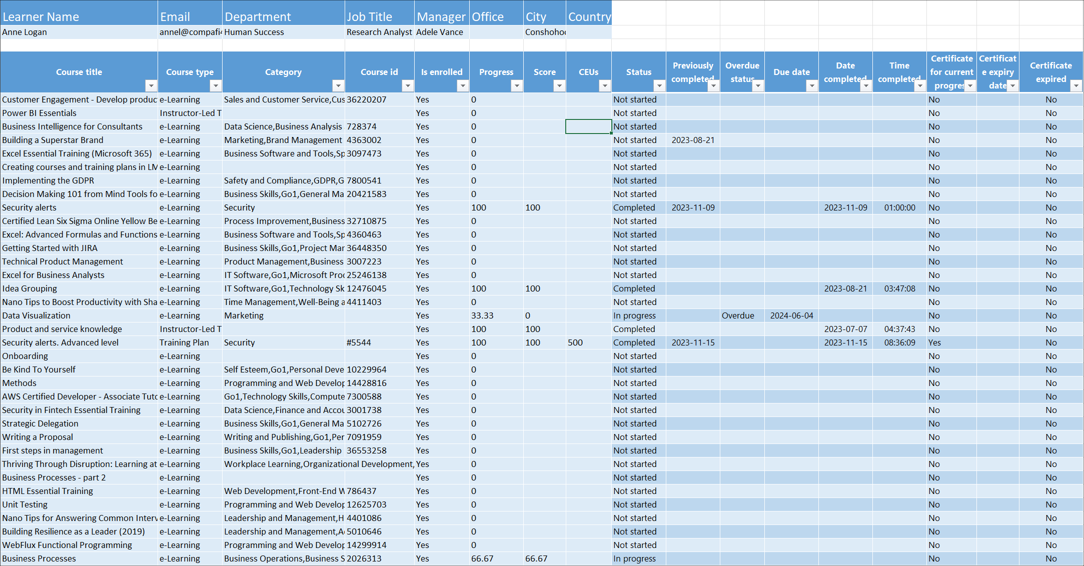 Die Zellen enthalten zusätzliche Informationen zum Lernenden: E-Mail-Adresse, Abteilung, Position, Manager, Büro, Ort, Land. Das Dashboard enthält diese Informationen nicht.