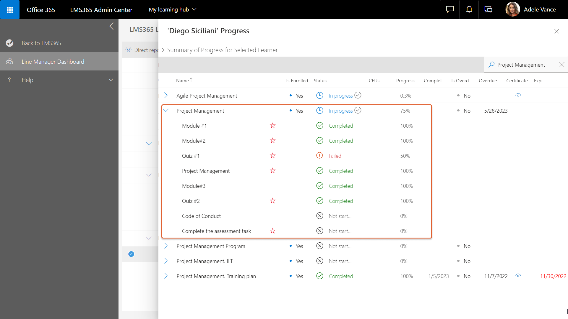 Das Linienmanager-Dashboard bietet die folgenden Optionen, um den Fortschritt eines Lernenden einzusehen: