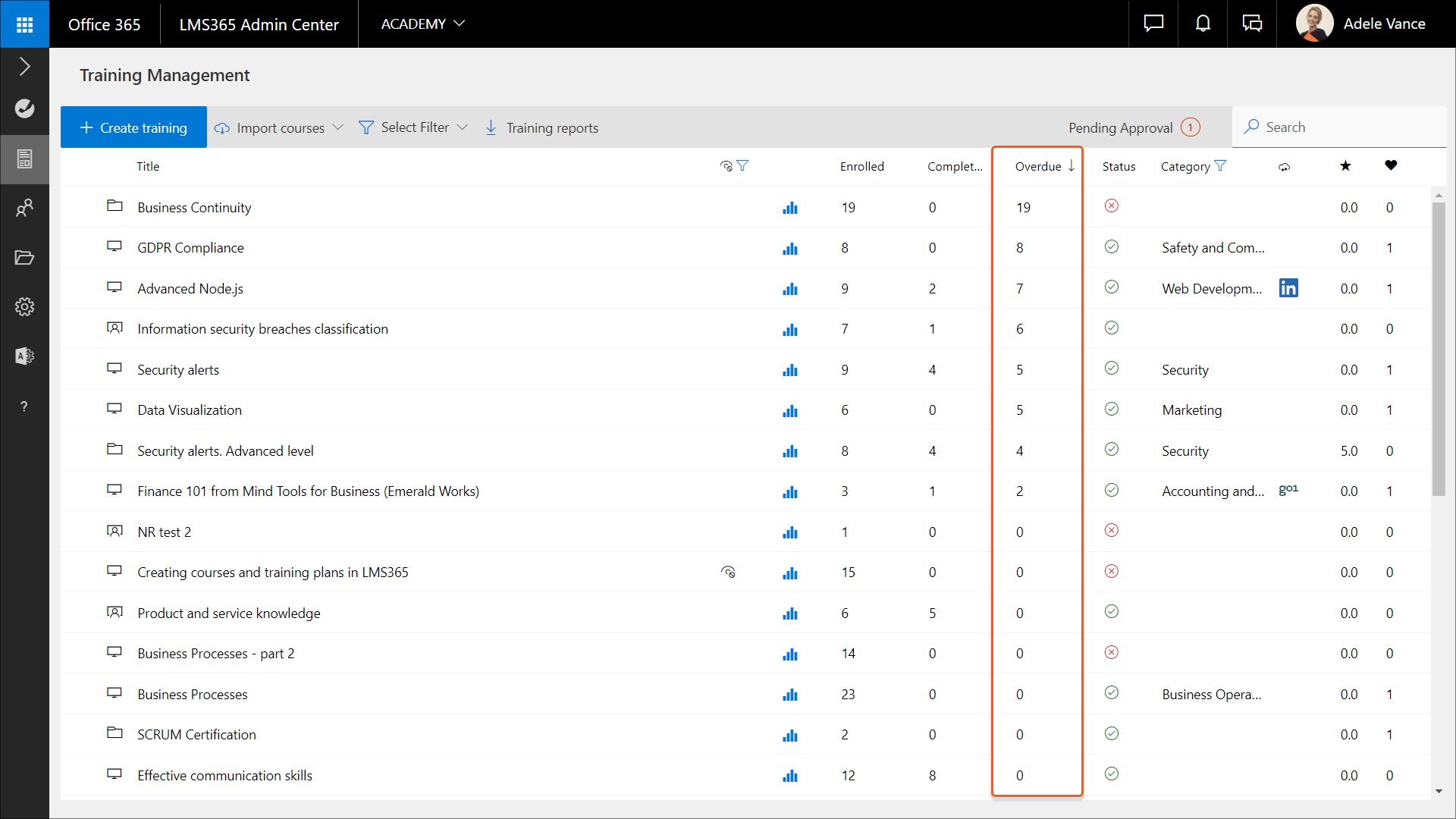 - Gehen Sie im Learn365 Admin Center zur Seite Schulungsverwaltung. Die Spalte Überfällig zeigt die Anzahl der Lernenden mit überfälligen Schulungen an.