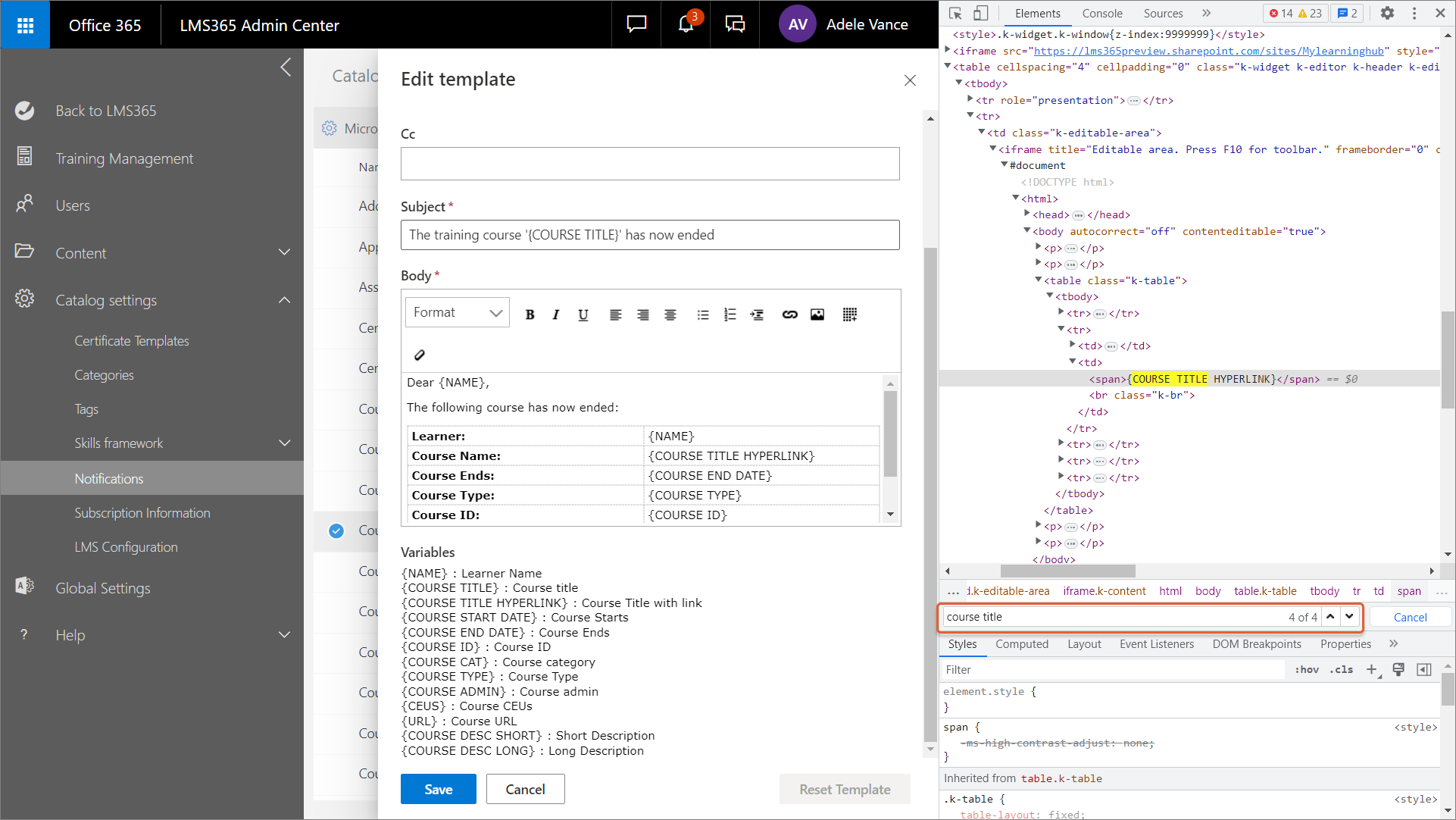 Learn365 sendet Lernenden und Admins eine Vielzahl von Benachrichtigungen, die durch verschiedene Aktionen der Benutzer ausgelöst werden. Außerdem können Katalogadministratoren Benachrichtigungsvorlagen so anpassen, dass sie besser zu den Anforderungen ihrer Organisation passen. In bestimmten Fällen können beim Bearbeiten einer Learn365-Benachrichtigungsvorlage versehentlich zusätzliche Leerzeichen in die Benachrichtigungsvariablen eingefügt werden. Dies kann verhindern, dass das System die relevanten Daten einfügt, was sich negativ auf das Erscheinungsbild und die Nutzung der Benachrichtigung auswirkt. Wenn durch eine einfache Bearbeitung der Benachrichtigungsvorlage das Problem nicht behoben werden kann, können Sie versuchen, im HTML-Code eine Lösung zu finden.