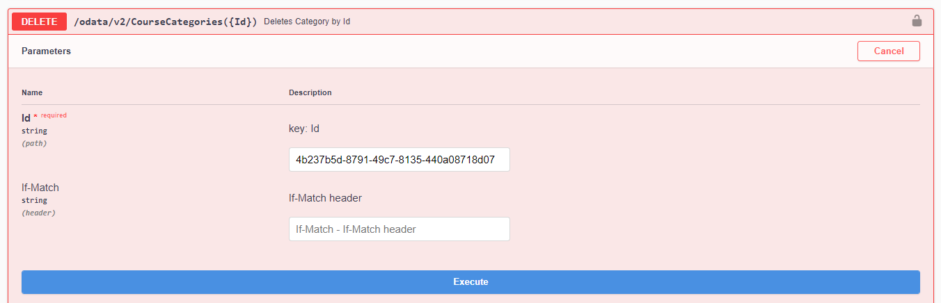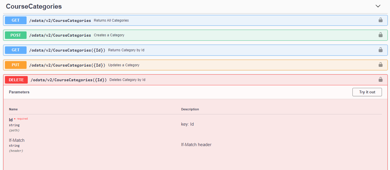 3. Suchen Sie im Abschnitt CourseCategories nach der Methode DELETE /odata/v2/CourseCategories({Id}) mit der Beschreibung Deletes Category by Id, wählen Sie sie aus und klicken Sie dann oben links auf Try it out.
