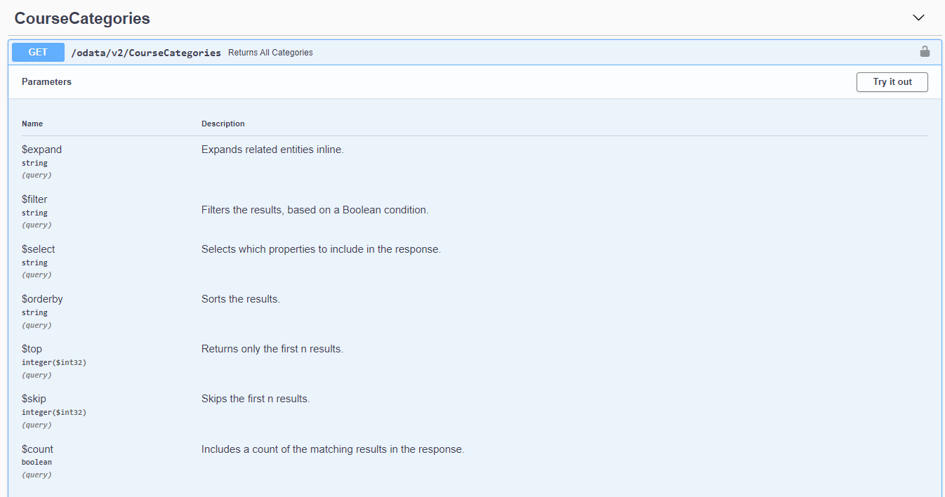 2. Suchen und erweitern Sie den Abschnitt CourseCategories, suchen Sie die Methode GET /odata/v2/CourseCategories mit der Beschreibung Returns All Categories und wählen Sie oben links Try it out aus.