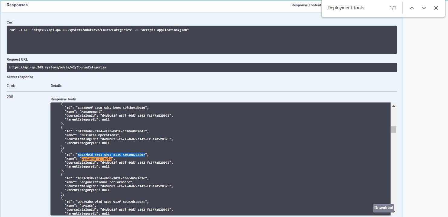 - Im Feld Response body werden die Daten zur Löschung der Kategorie angezeigt, etwa der Löschzeitpunkt als Datum und Uhrzeit. Sie können in der Kategorienliste unter Learn365 Admin Center > Katalogeinstellungen > Kategorien kontrollieren, dass die Kategorie gelöscht wurde.