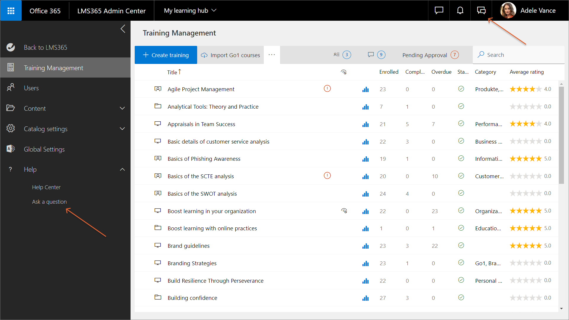 - Klicken Sie im Learn365 Admin Center entweder oben rechts auf der Symbolleiste auf das Dialogsymbol (Sprechblasensymbol) oder im Bereich Hilfe auf Frage stellen.