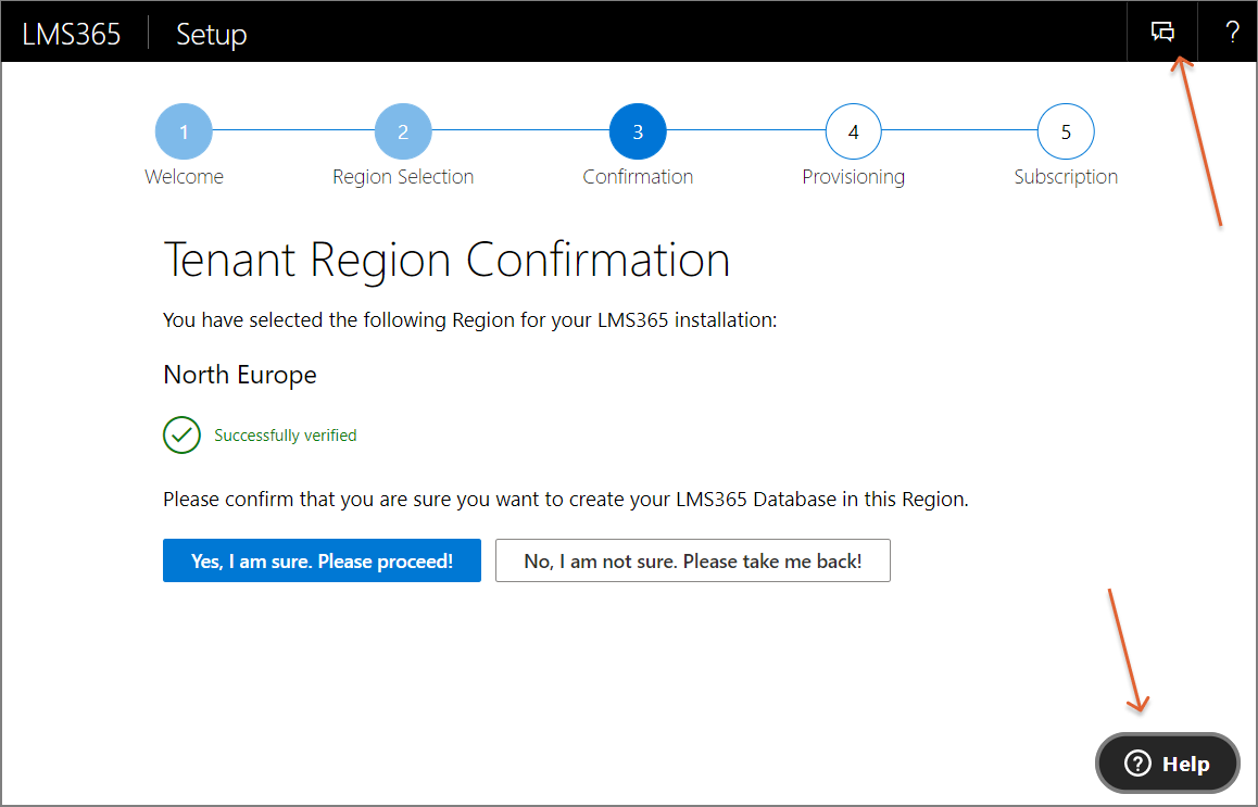 - Während der Installation können Sie auf das Symbol Hilfe unten auf der Seite oder aber auf das Dialogsymbol (Sprechblasensymbol) oben rechts auf der Seite klicken.