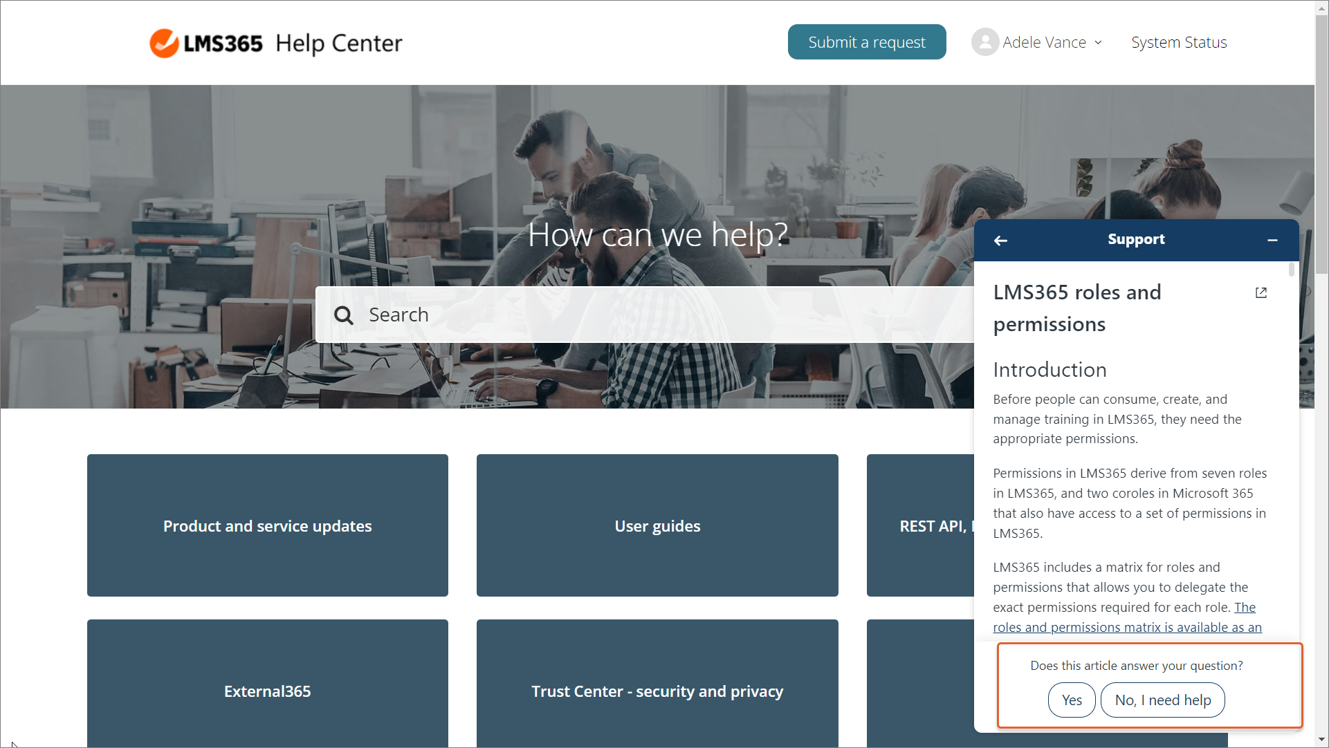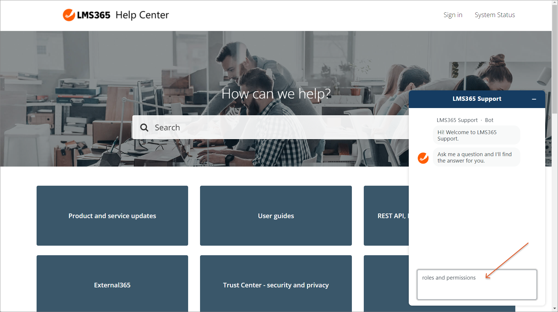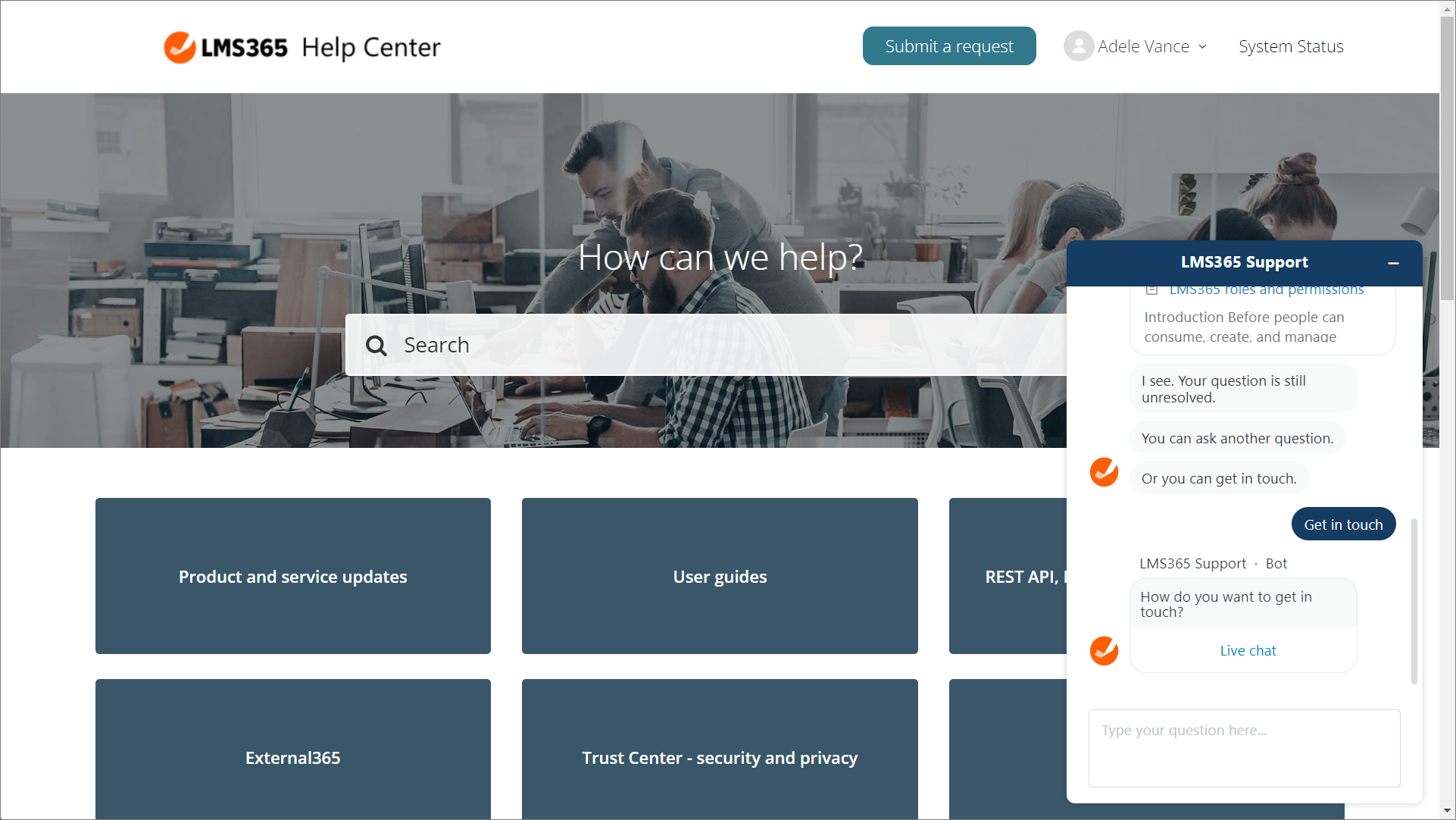 Im Zensai-Hilfecenter und im Learn365 Admin Center können Sie jederzeit auf die Produktdokumentation zugreifen und Antworten auf häufig gestellte Fragen erhalten. Zusätzlich kann der Zensai-Support-Chatbot Sie auf relevante Artikel im Zensai-Hilfecenter aufmerksam machen.