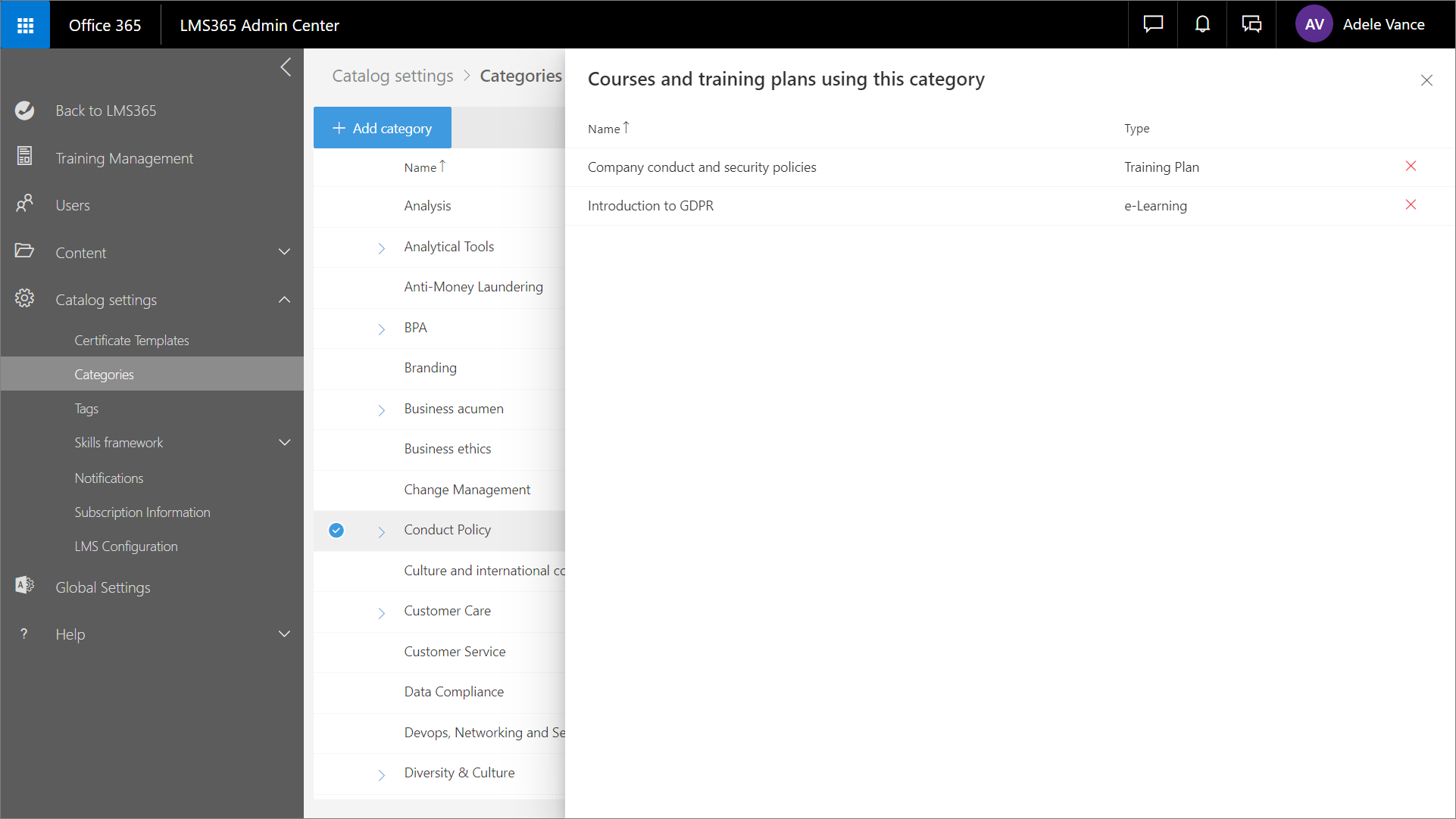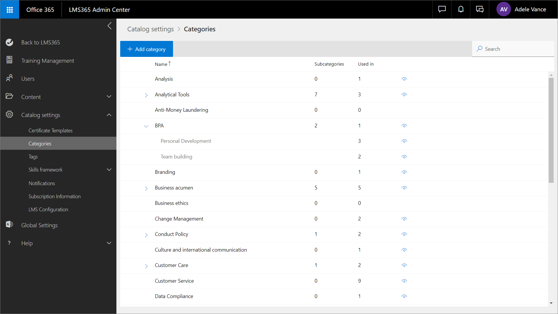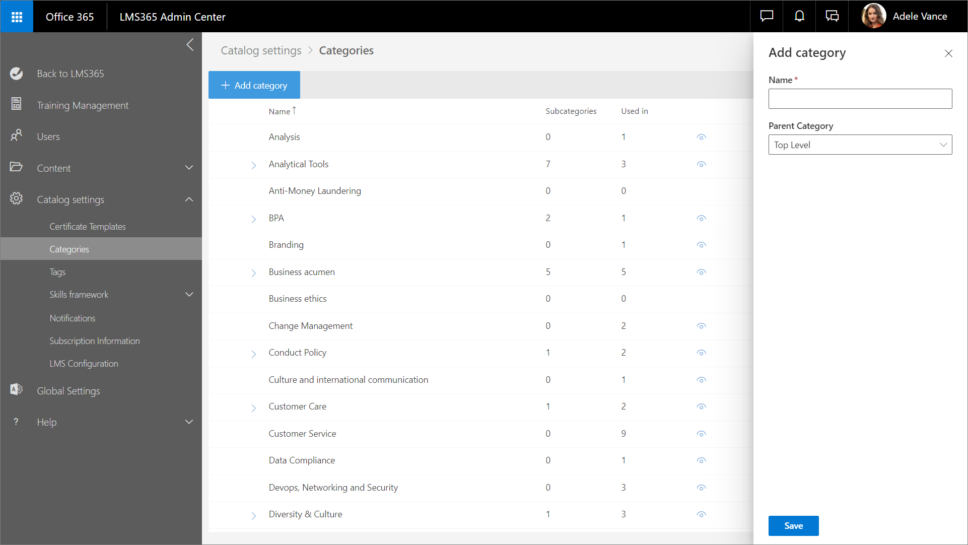 1. Gehen Sie zu Learn365 Admin Center > Katalogeinstellungen > Kategorien.