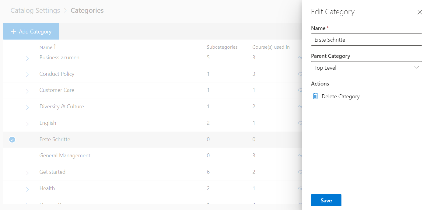 1. Gehen Sie zu Learn365 Admin Center > Katalogeinstellungen > Kategorien und wählen Sie die Kategorie oder Unterkategorie aus, die Sie bearbeiten möchten.