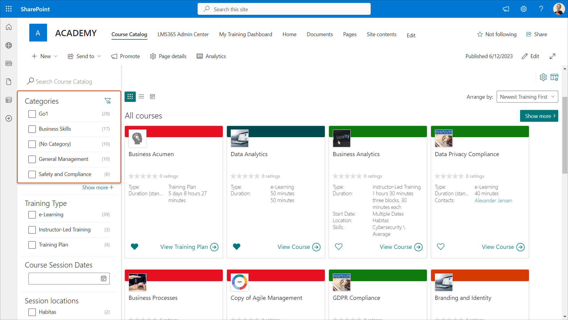 Ausführliche Informationen darüber, wie Benutzer Kurse und Schulungspläne auf der Kurskatalogseite suchen und filtern können, finden Sie in diesem Artikel.