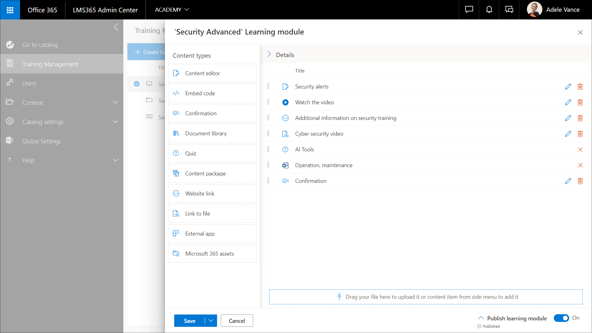 Der Learn365 Lernmodul-Editor hilft Ihnen beim Anordnen von Lerninhalten wie Dokumenten, Videos, Quiz und Inhaltspaketen in aufeinanderfolgenden Lernschritten.