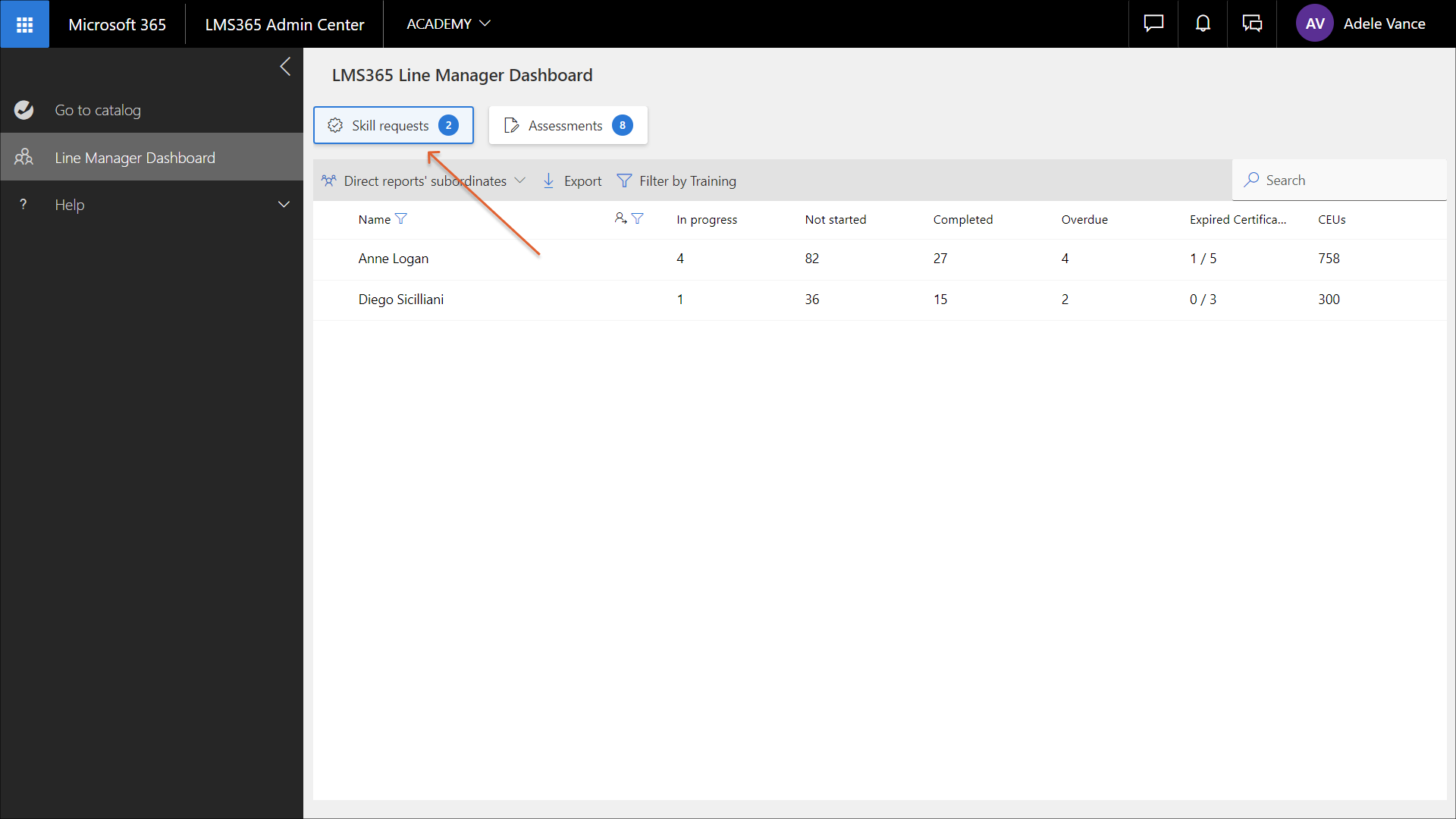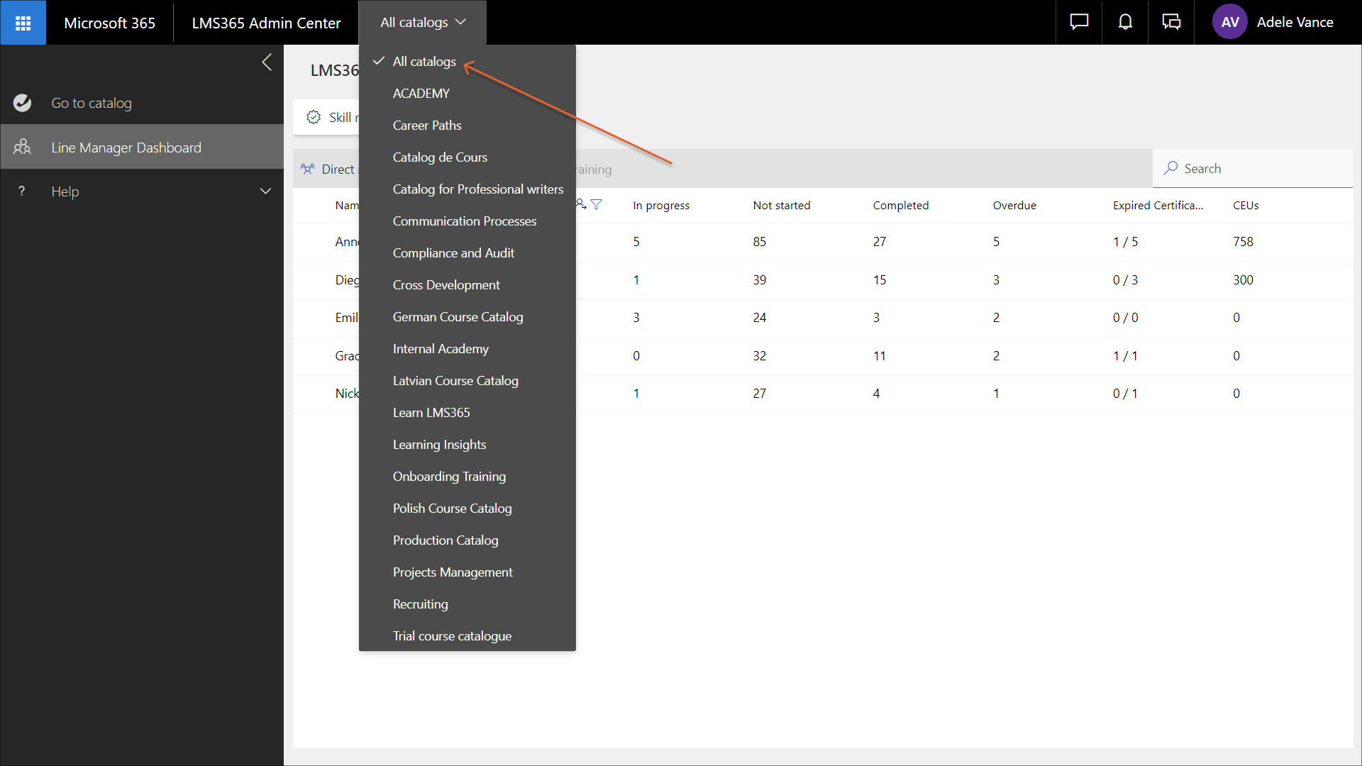 Beim Zugriff über Mein Schulungs-Dashboard werden Linienmanager zum Linienmanager-Dashboard des zugehörigen Katalogs weitergeleitet. Der Name des Katalogs wird in der Katalogauswahl oben auf der Seite angezeigt.