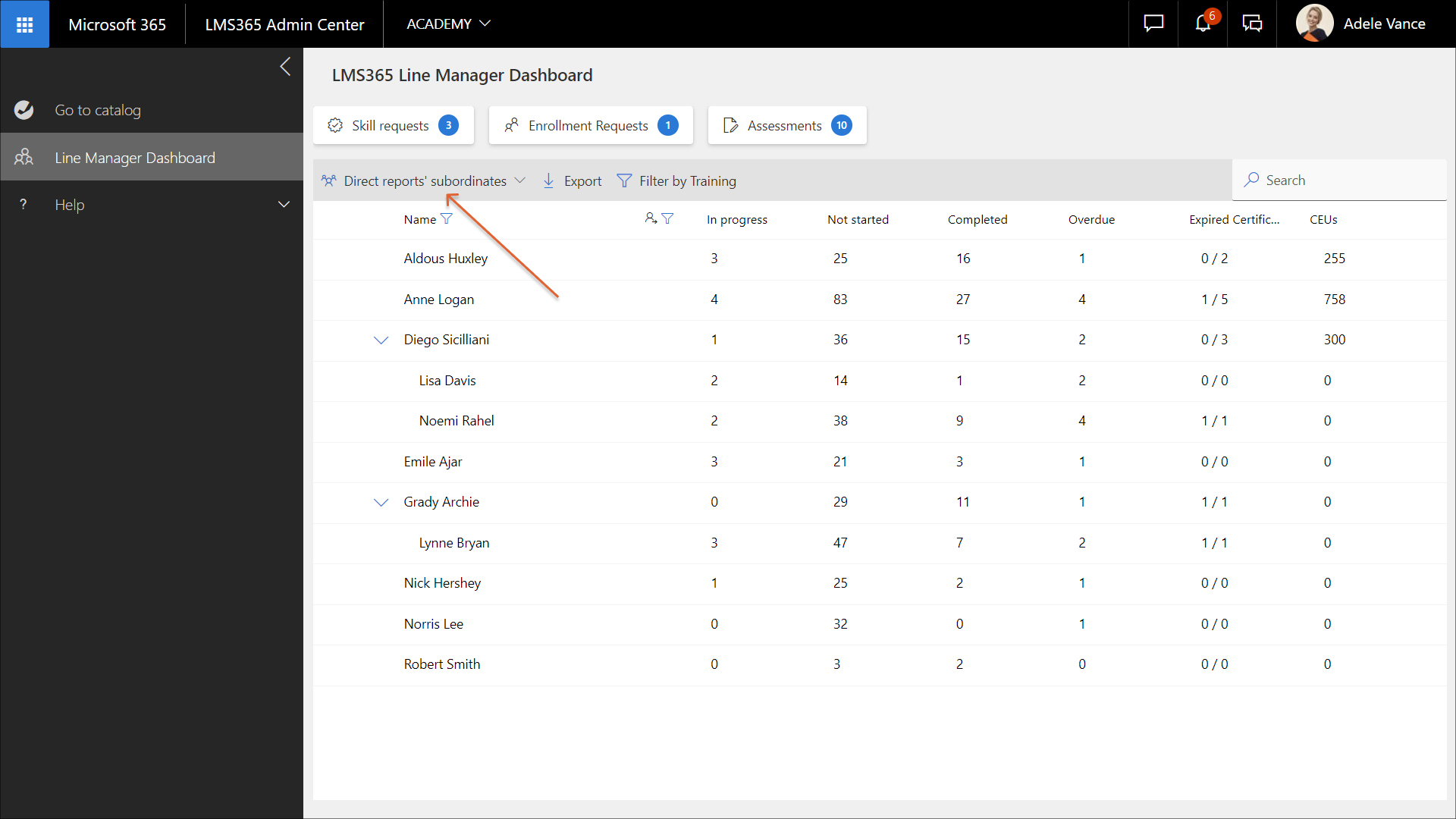 - Linienmanager erhalten eine zusammengefasste Übersicht über den Lernfortschritt der Untergebenen für alle Kataloge, auf die der Linienmanager Zugriff hat.