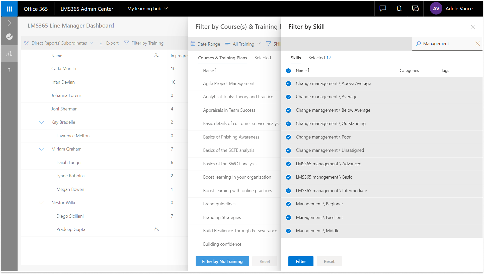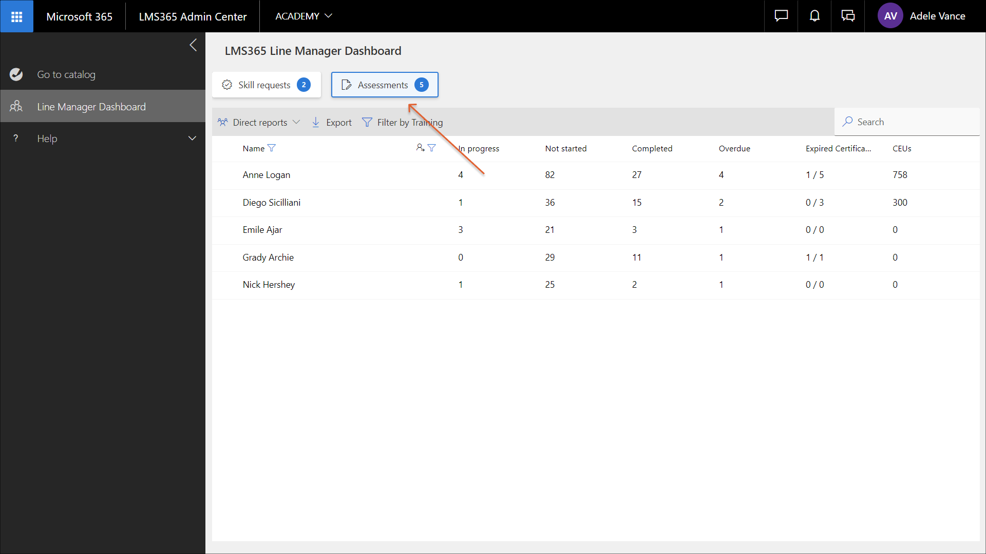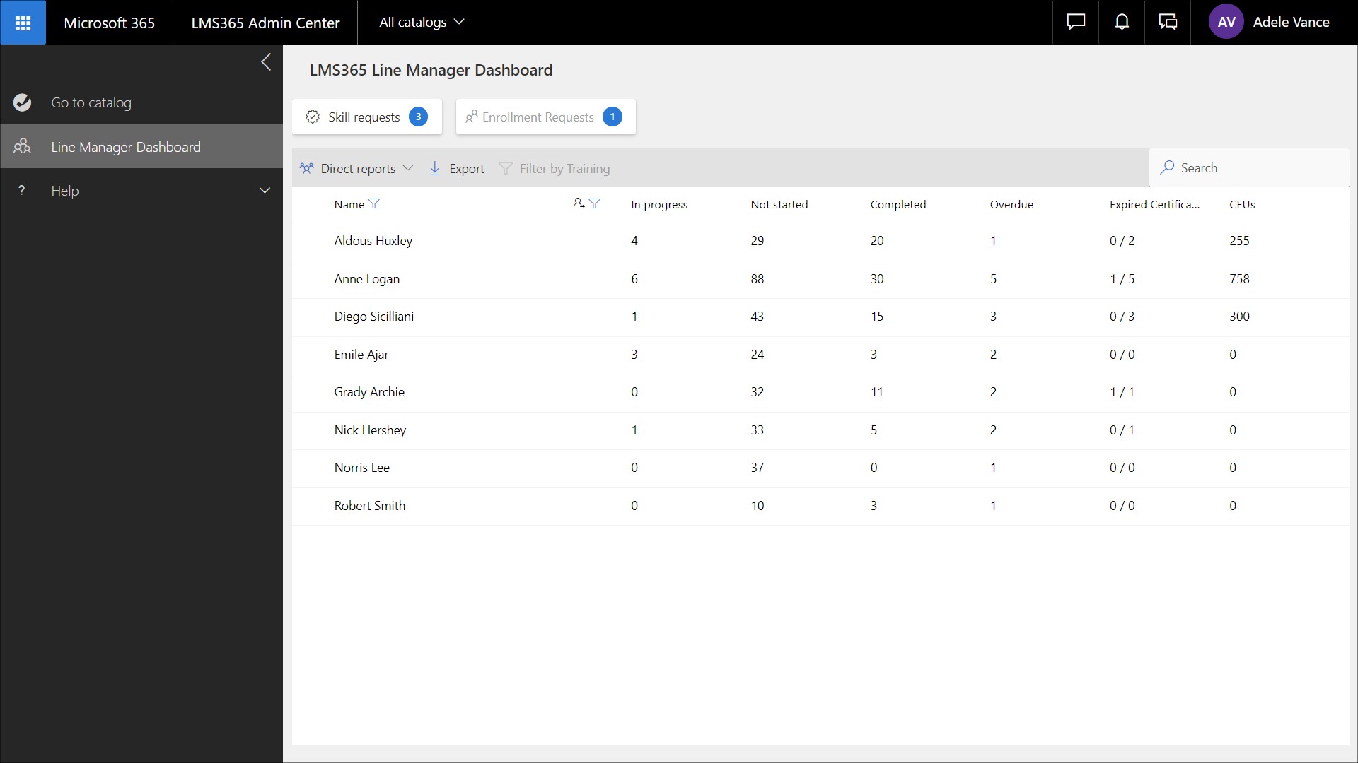 Linienmanager können die Schulungsaktivitäten ihrer Untergebenen im Linienmanager-Dashboard, das über das Learn365 Admin Center zugänglich ist, beobachten und verwalten.