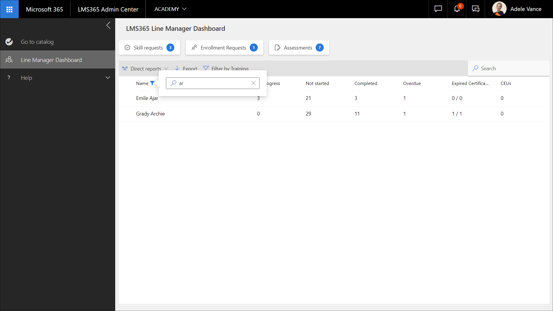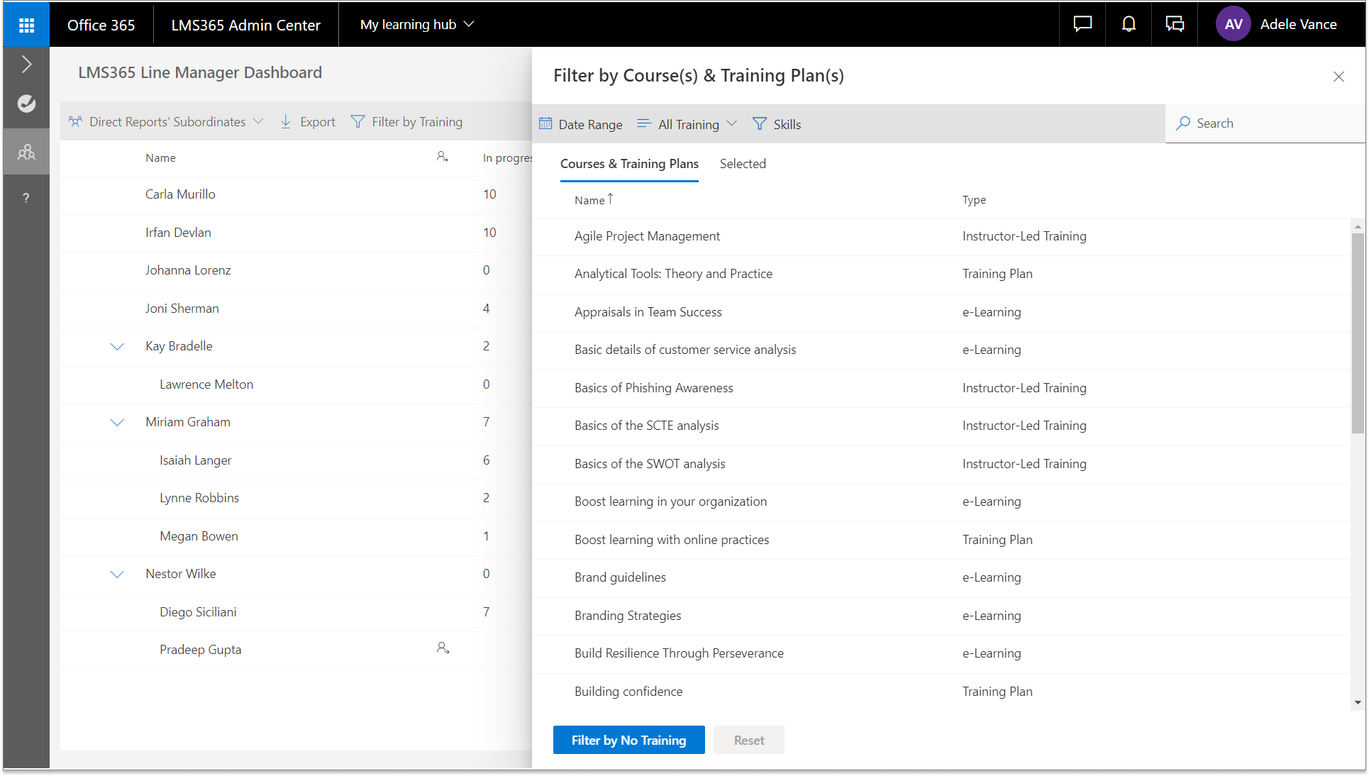 Standardmäßig werden alle Kurse und Schulungspläne im aktuellen Katalog angezeigt. Linienmanager können die Informationen nach Zeitraum, Veröffentlichungsstatus, Schulungstyp und bei erfolgreichem Abschluss der Schulung vergebenen Qualifikationen filtern. Ferner können sie Filter nach Keine Schulung auswählen, um Benutzer anzuzeigen, die derzeit in keiner Schulung registriert sind, und die Ergebnisse mit dem Feld Suchen weiter filtern.