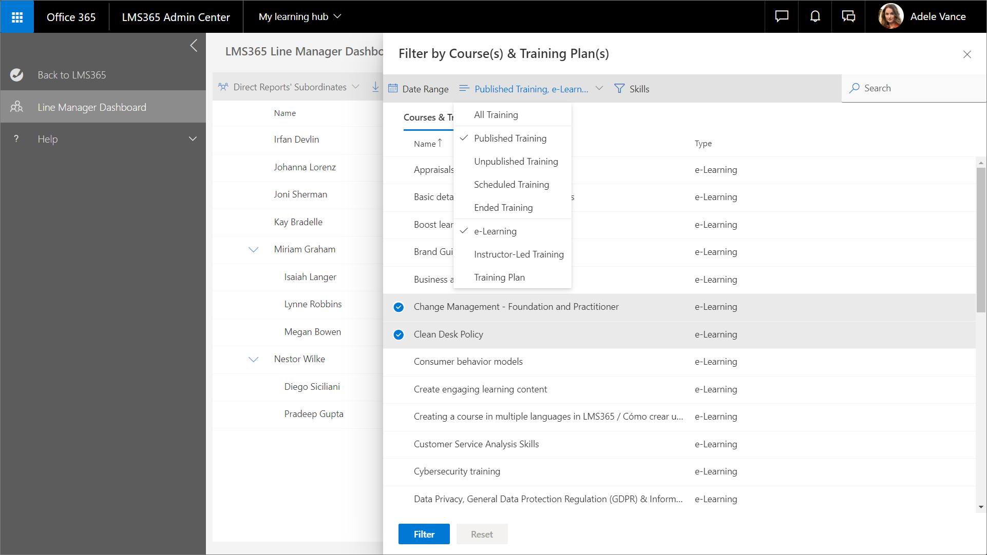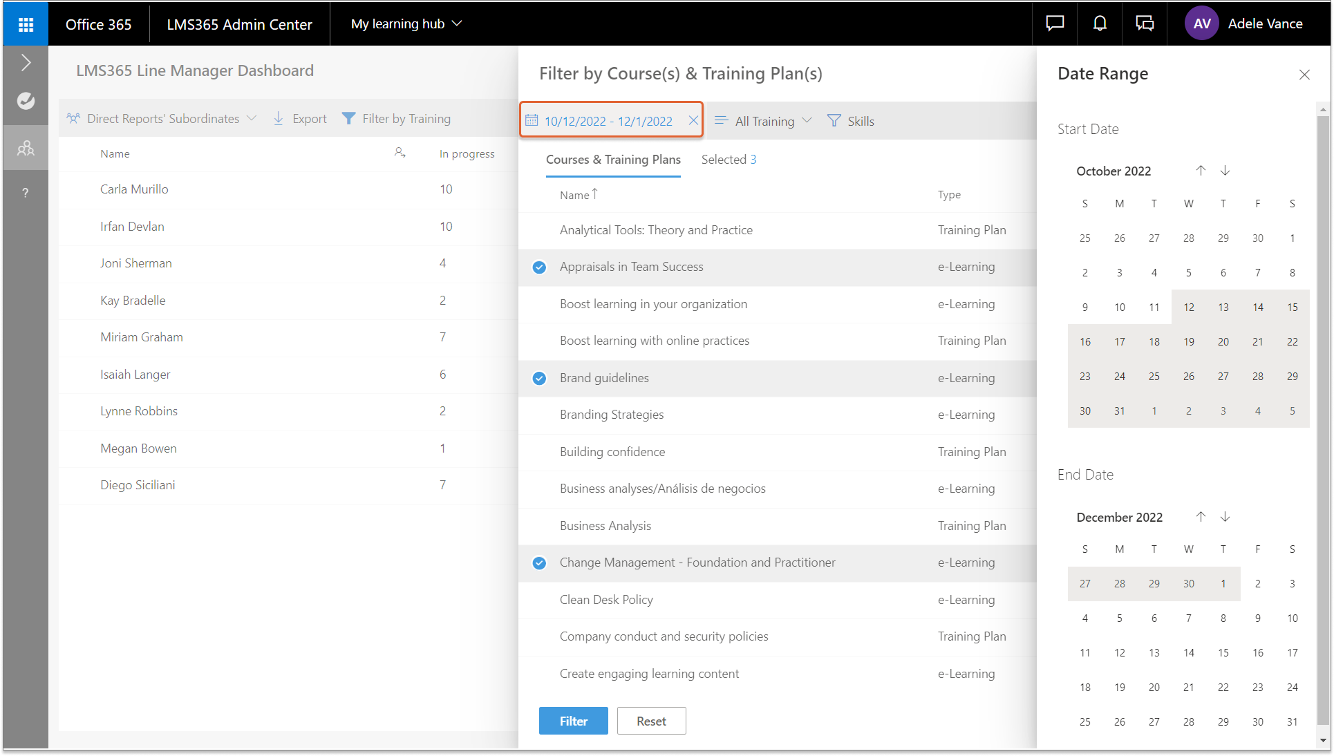Der Bereich Nach Kursen und Schulungsplänen filtern bleibt geöffnet; zum Schließen klicken Sie einfach außerhalb des Bereichs. Wenn Sie den Bereich schließen, werden alle von Ihnen angewendeten Filter beibehalten.