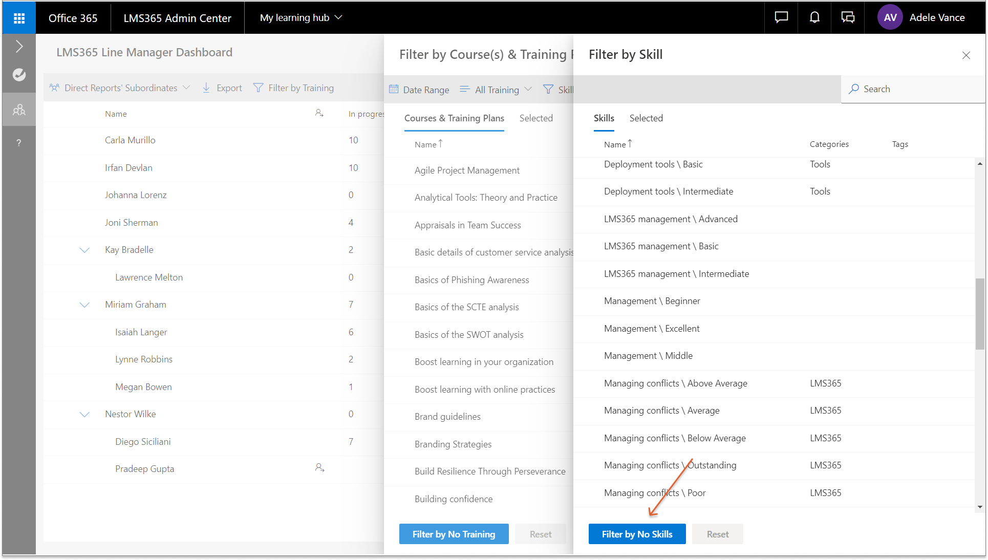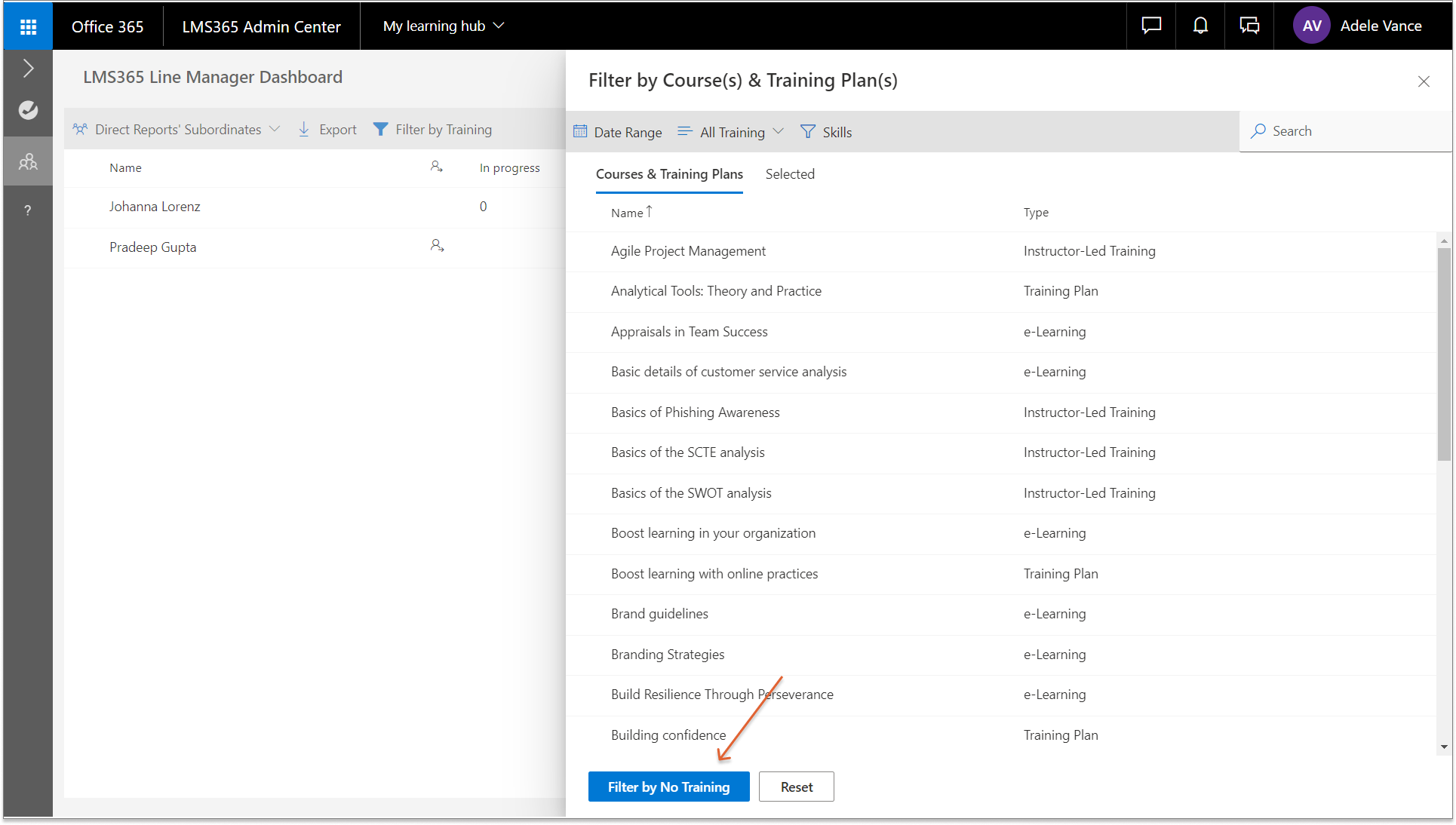 Wählen Sie im Bereich Nach Kursen und Schulungsplänen filtern den Filter Filtern nach Keine Schulung aus. Filtern nach Keine Schulung wird nur angezeigt, wenn kein Kurs oder Schulungsplan im Bereich ausgewählt ist.