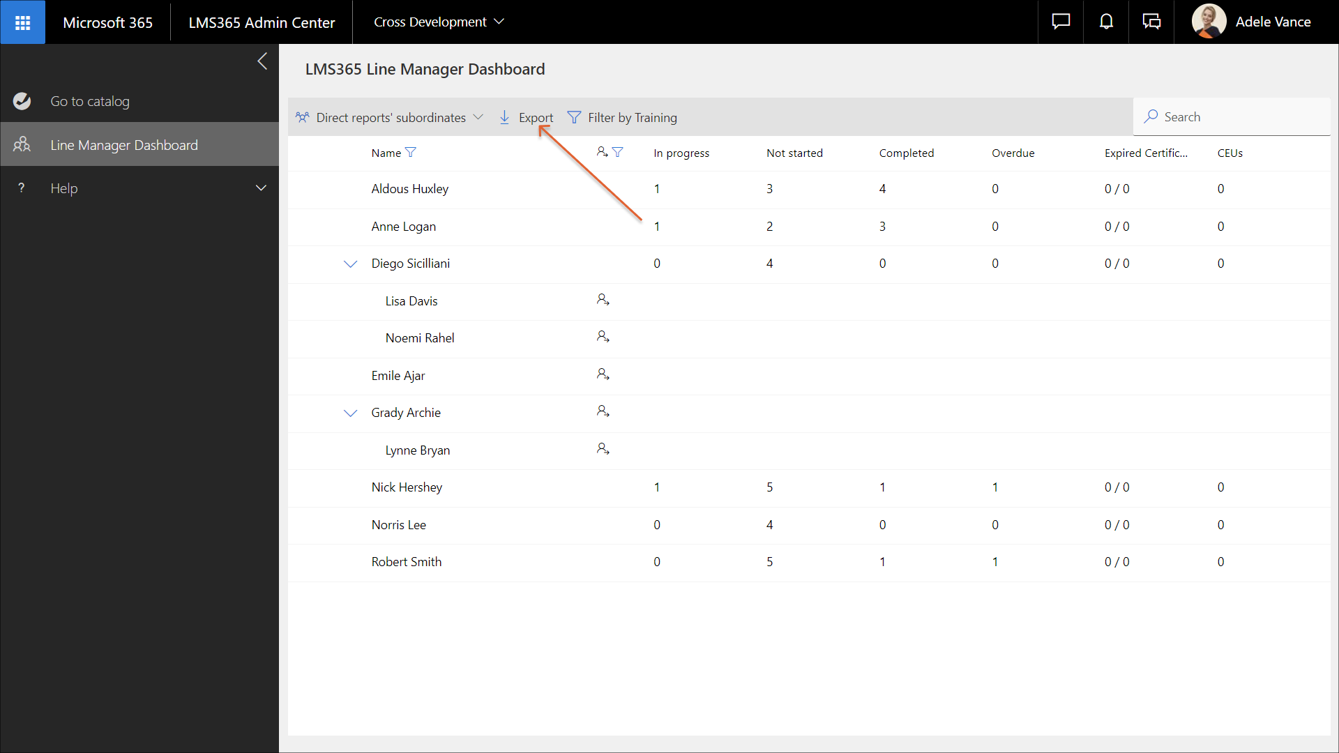 Linienmanager können auf Exportieren klicken, um die im Linienmanager-Dashboard angezeigten Informationen herunterzuladen. Nur die in der aktuellen Ansicht gezeigten Informationen werden in den Bericht aufgenommen.