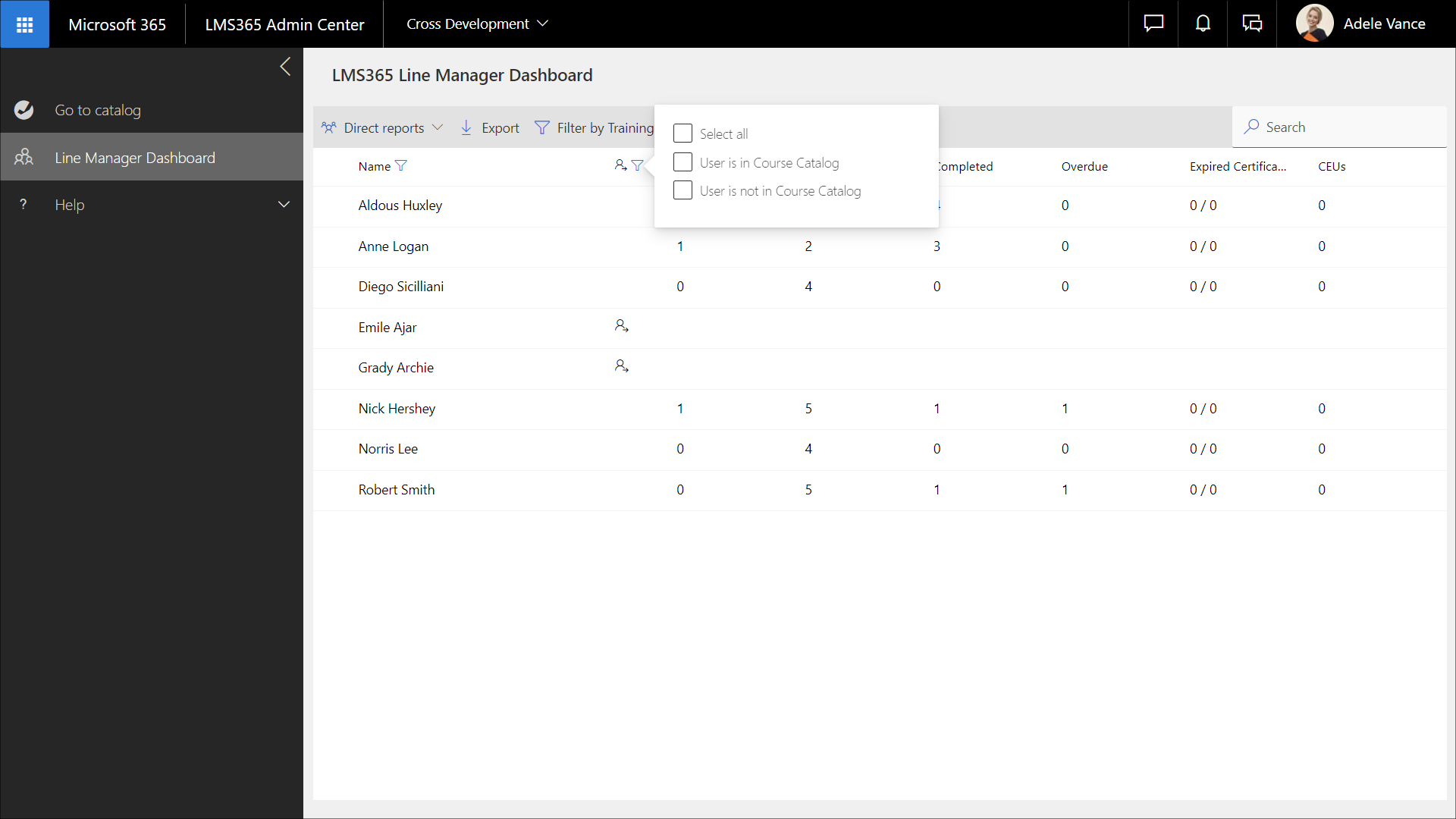 Linienmanager können auch Benutzer anzeigen, die derzeit nicht für Kurse oder Schulungspläne im Katalog registriert sind.