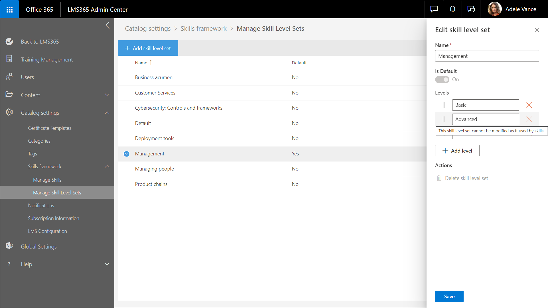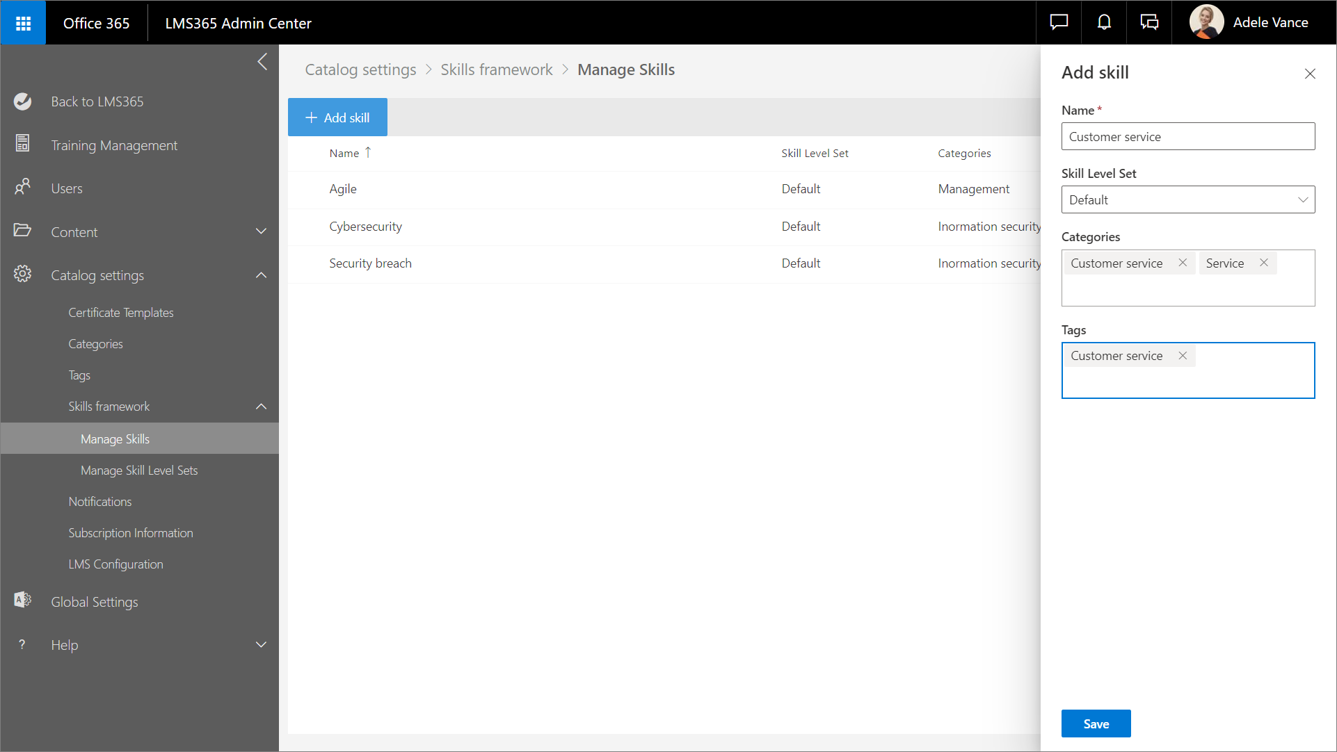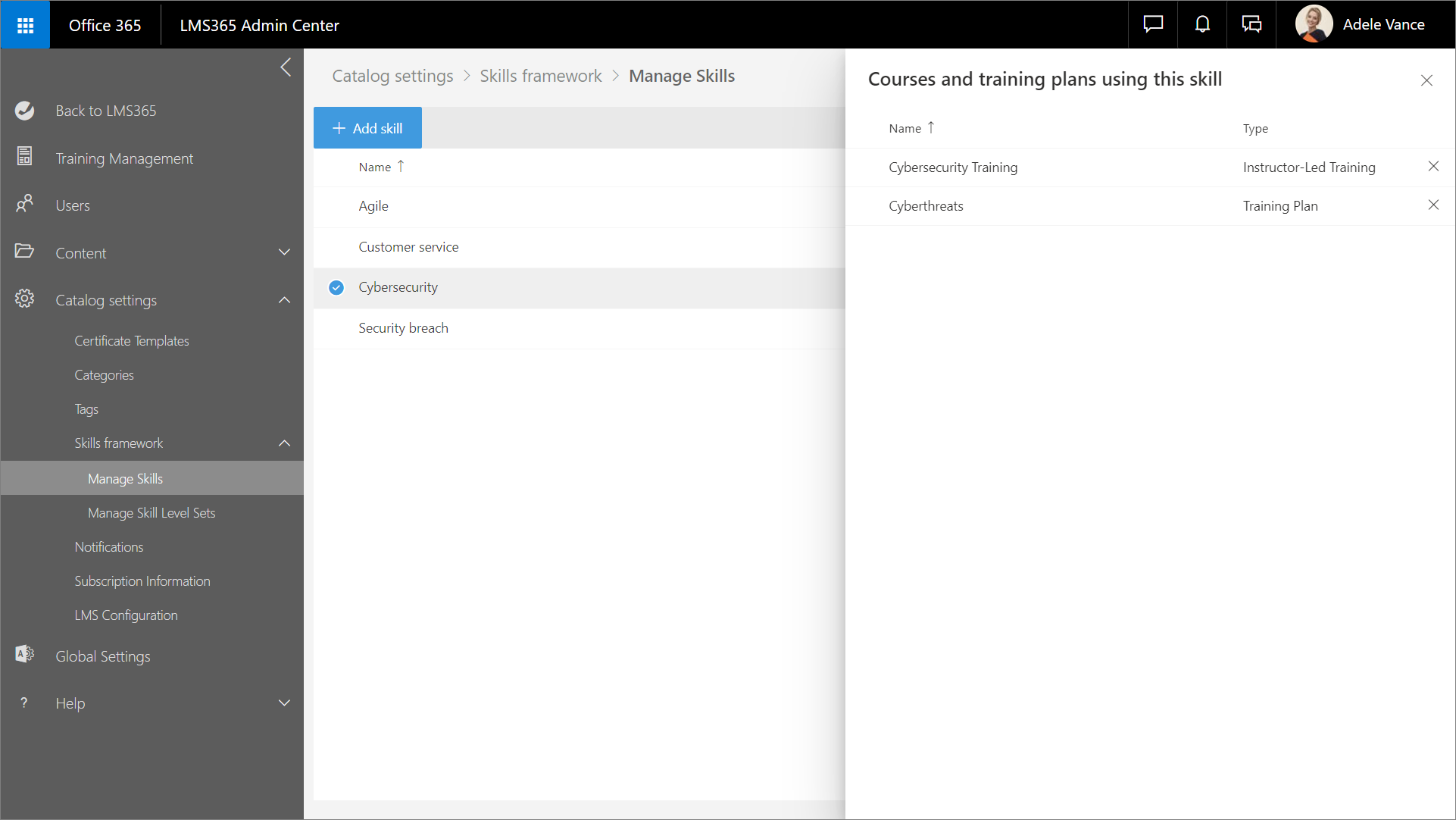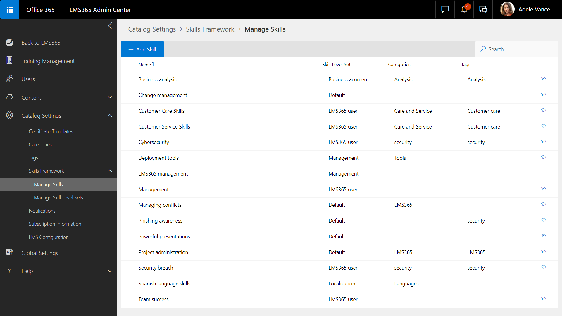 Im Learn365 Admin Center gehen Sie zu Katalogeinstellungen > Qualifikationsframework > Qualifikationen verwalten.