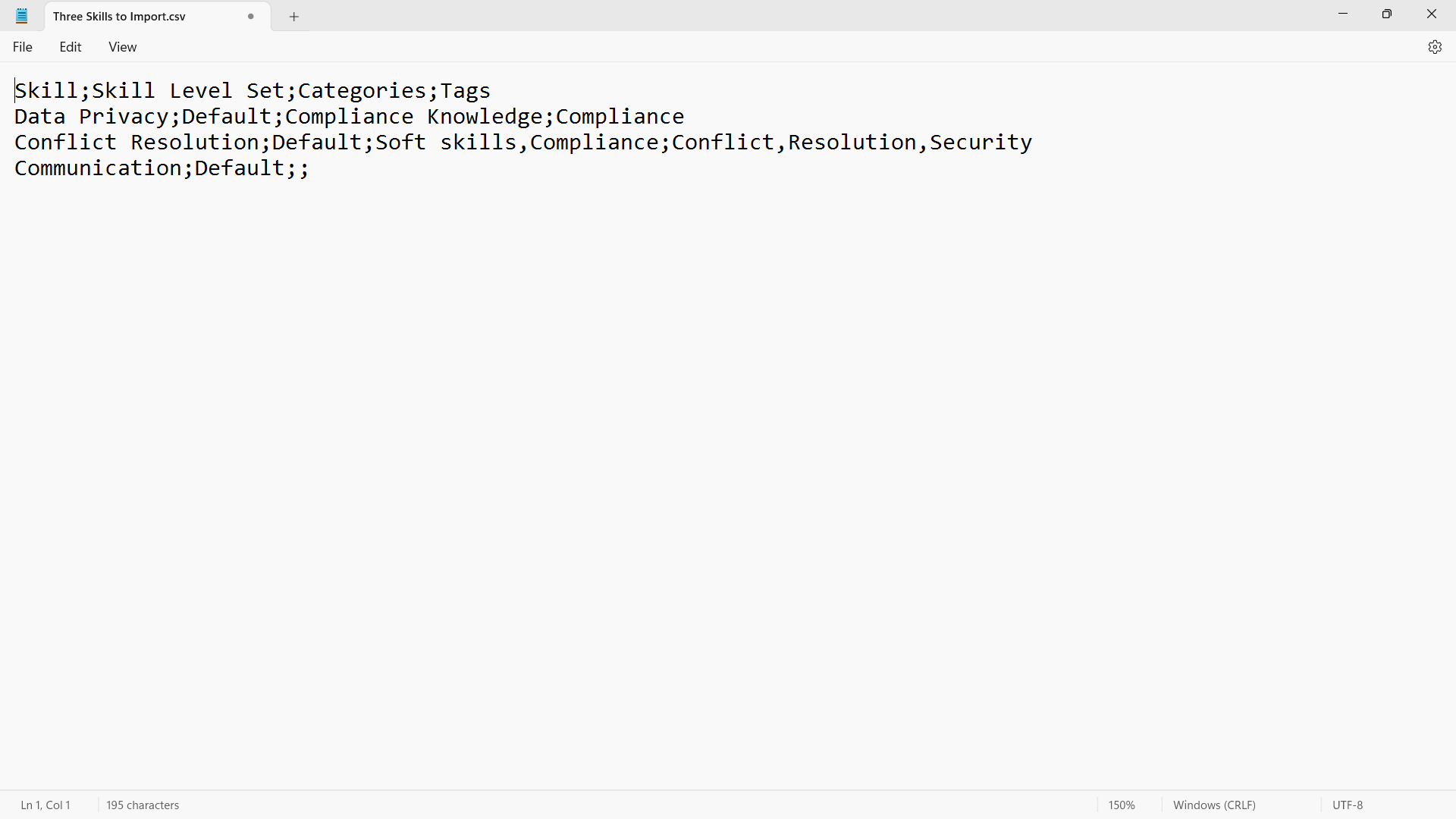 - Die Felder Qualifikation, Qualifikationsgruppe, Kategorien und Tags müssen durch ein Semikolon (;) getrennt werden. Wenn eine Qualifikation keine Kategorien oder Tags hat, fügen Sie an dieser Stelle einfach ein Semikolon (;) ein.
