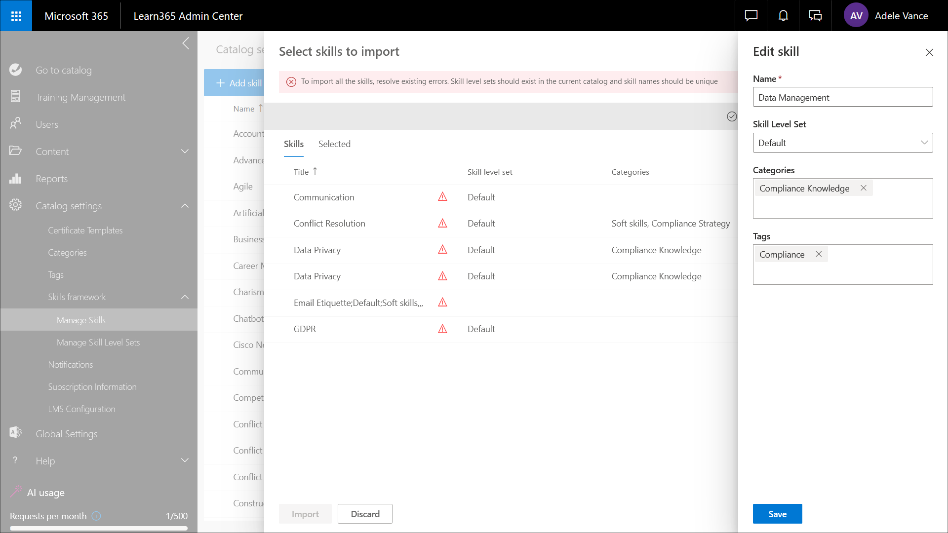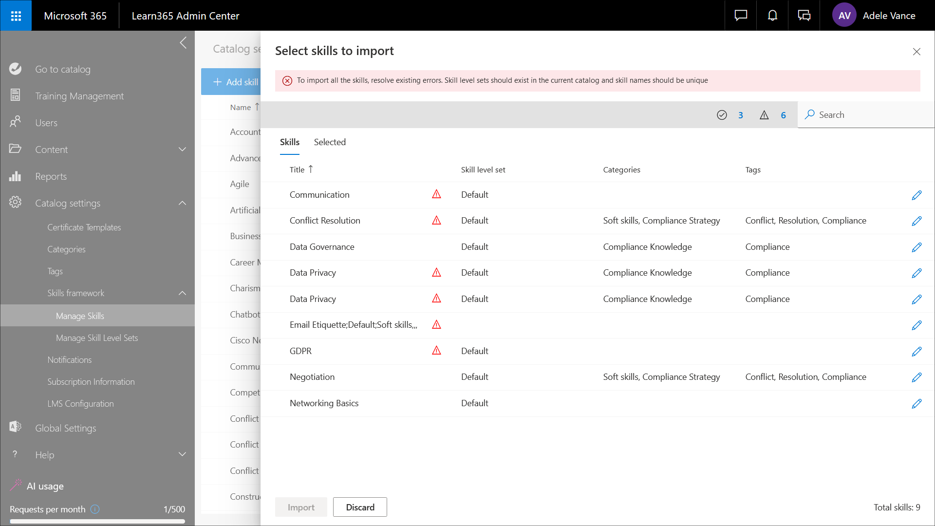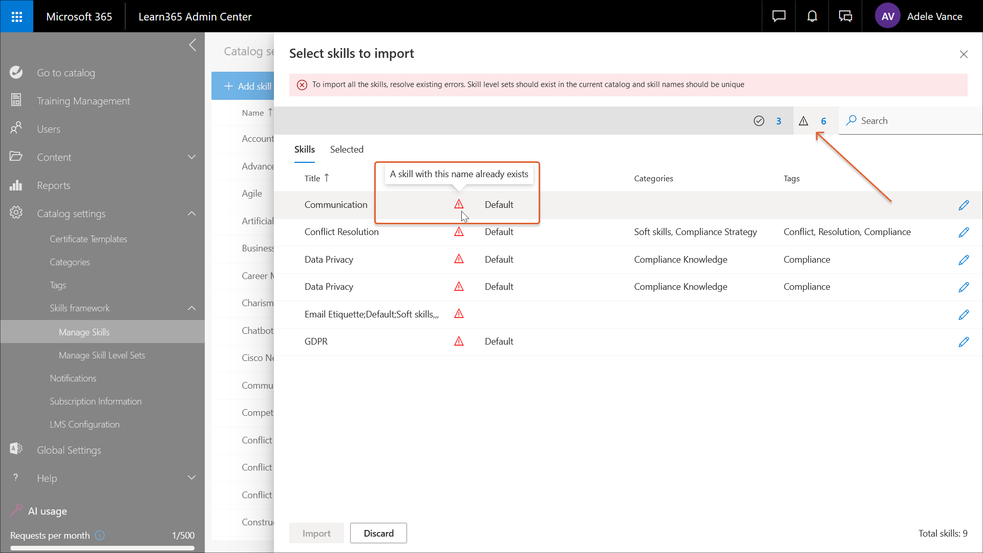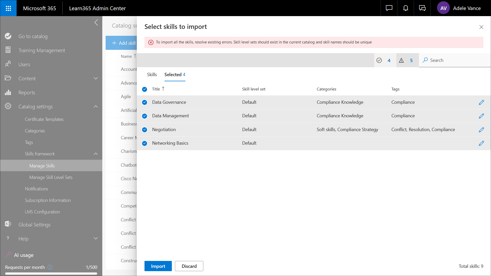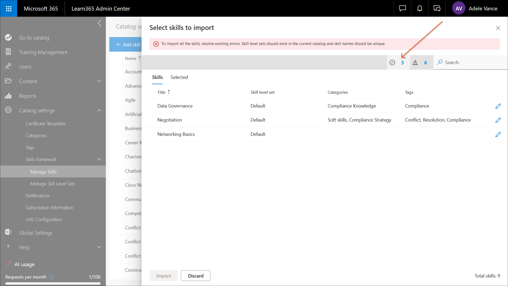 Wählen Sie Importieren, wenn Sie bereit sind, die ausgewählten Qualifikationen zu importieren. Sie sehen den Status des Qualifikationsimports unter Benachrichtigungen (das Glockensymbol). Sobald sie importiert sind, können Sie die Qualifikationen auf die übliche Weise verwalten.