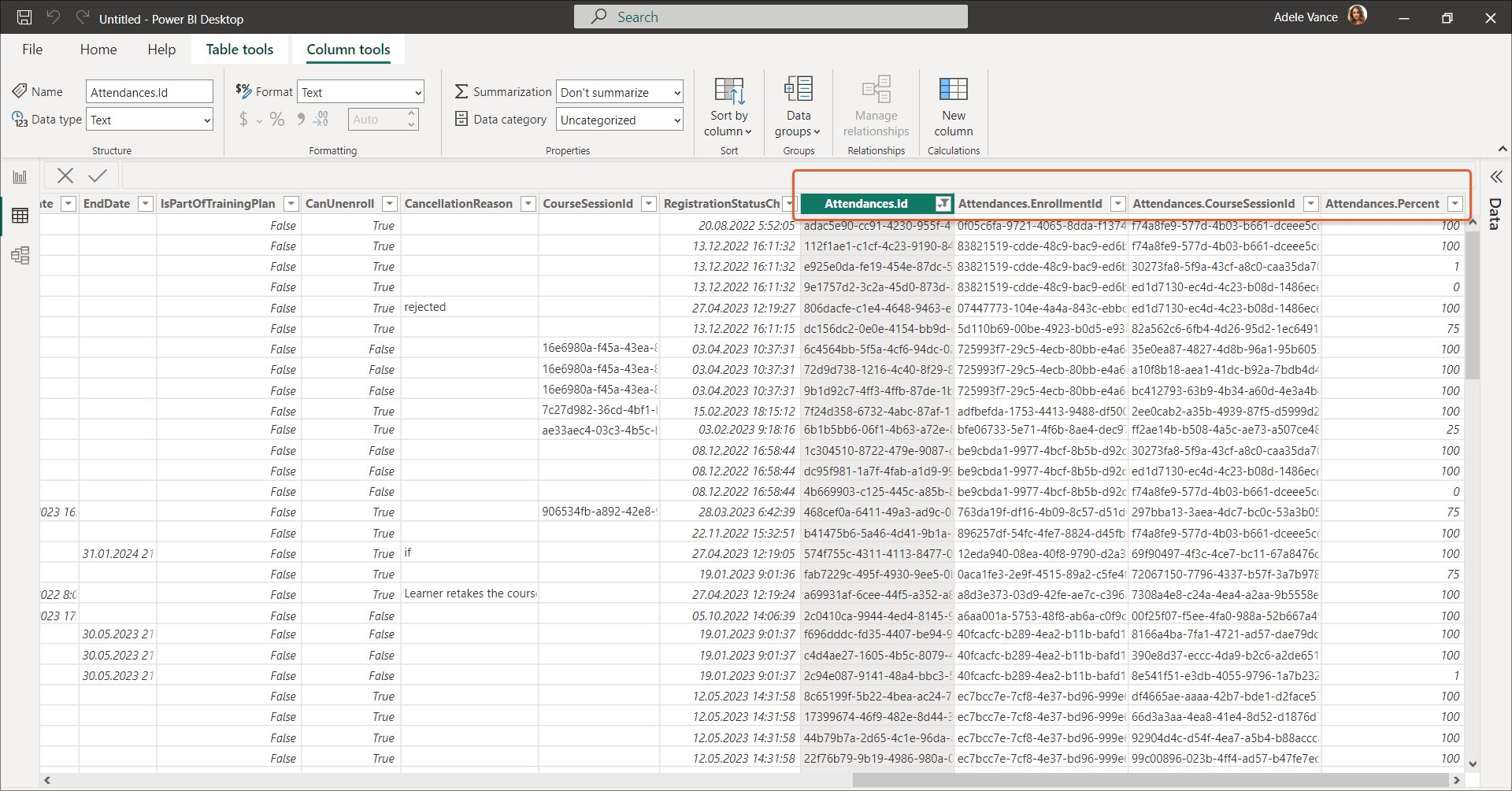 1. Suchen Sie in der Datenansicht in Power BI Desktop wie in diesem Artikel beschrieben nach dem Datenfeld Attendances.