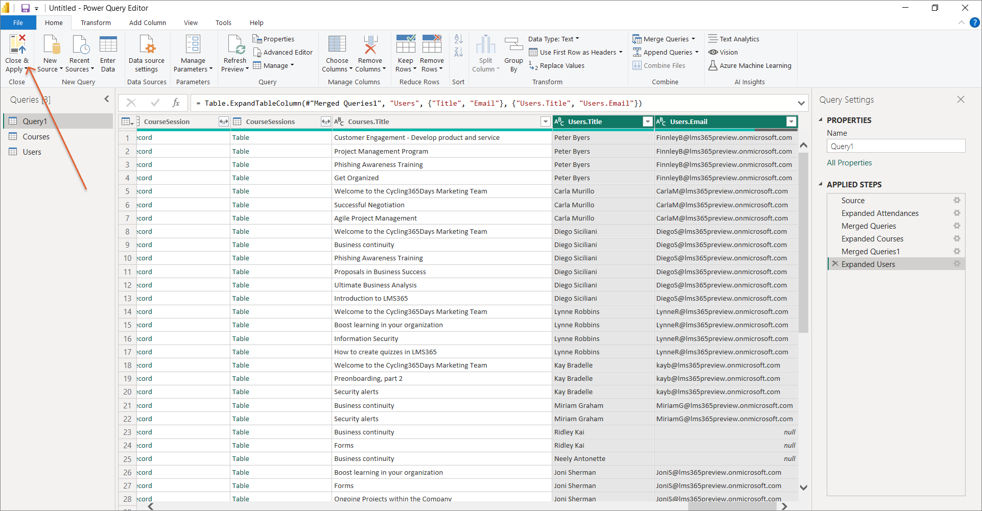 12. In der hinzugefügten Spalte Users klicken Sie auf das Symbol Erweitern und wählen dann die Spalten aus, die Sie einbeziehen möchten. In diesem Beispiel haben wir Title und Email ausgewählt.
