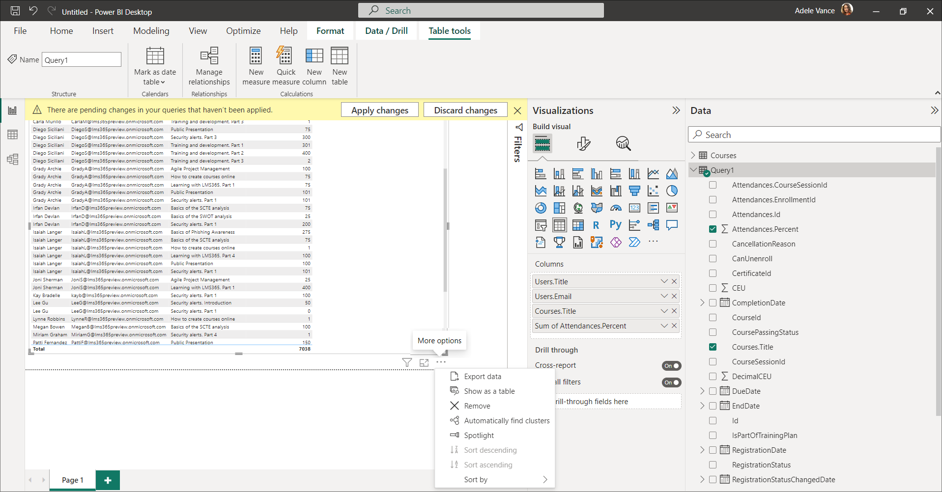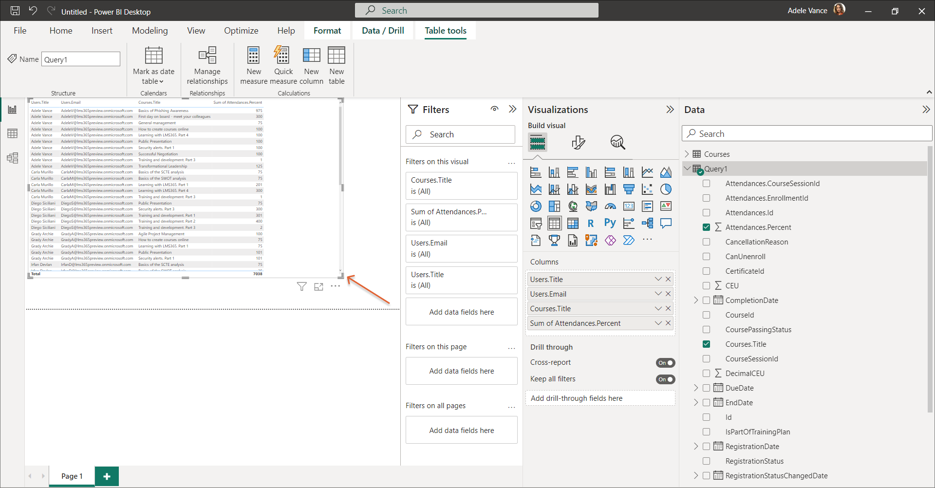 17. Im Bereich Daten erweitern Sie Query1 und aktivieren die Kontrollkästchen derjenigen Datenfelder, die Sie Ihrem Bericht hinzufügen möchten. In diesem Beispiel haben wir die Datenfelder Users.Title, Users.Email, Courses.Title und Attendances.Percent ausgewählt.