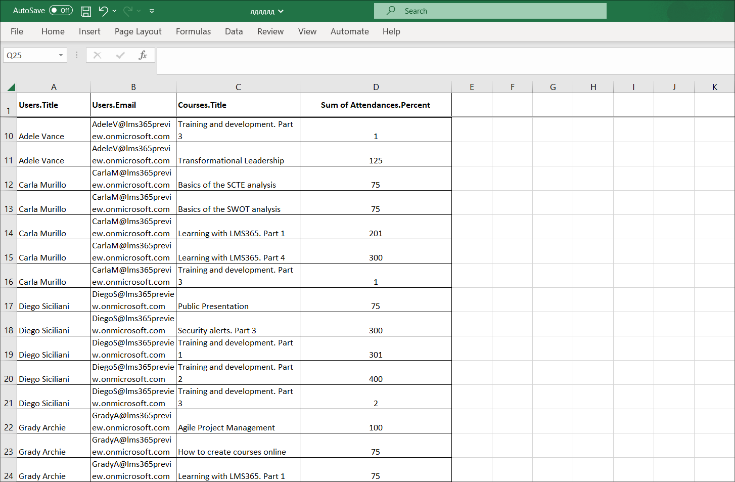 Das Beispiel in diesem Artikel zeigt, wie Sie einen Anwesenheitsbericht der Lernenden erstellen. Der Bericht enthält außerdem Tabellen mit dem Namen der Lernenden, ihren E-Mail-Adressen und Kursinformationen.
