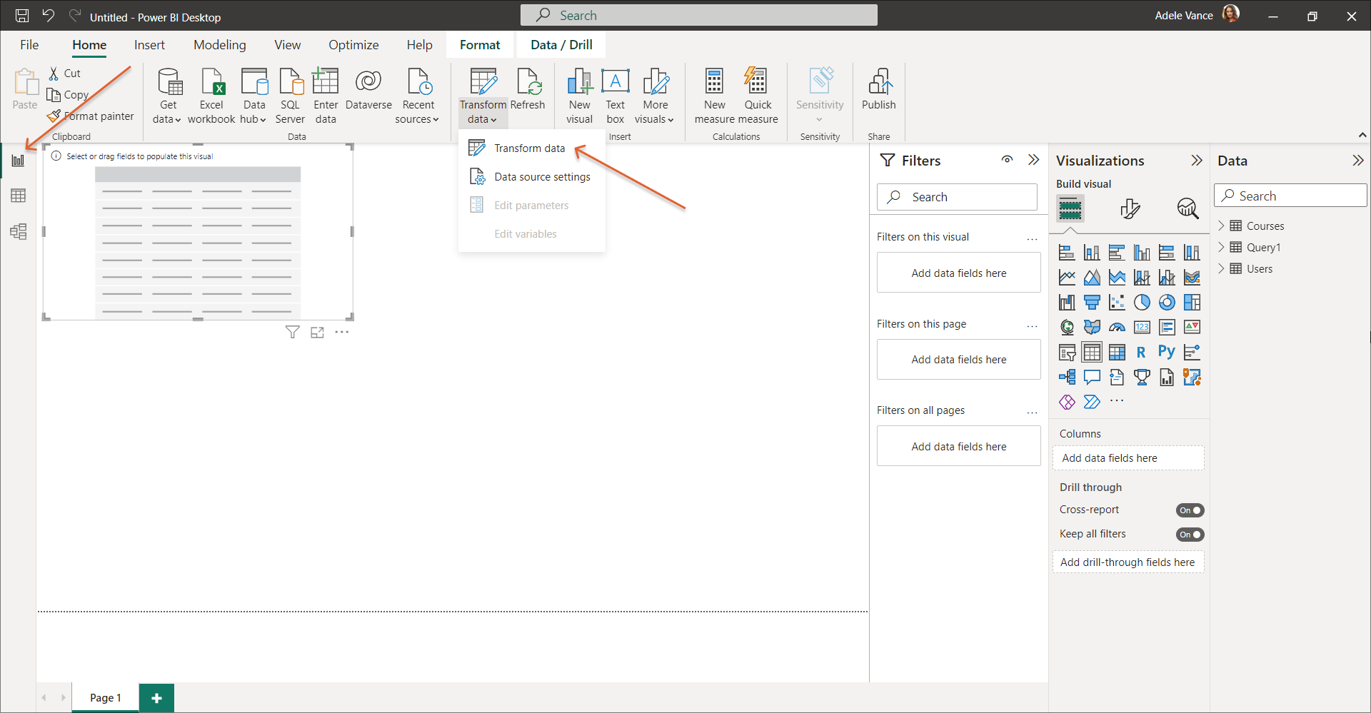 3. In der linken Navigationsleiste klicken Sie auf das Symbol Berichtsansicht und dann auf Daten transformieren > Daten transformieren.