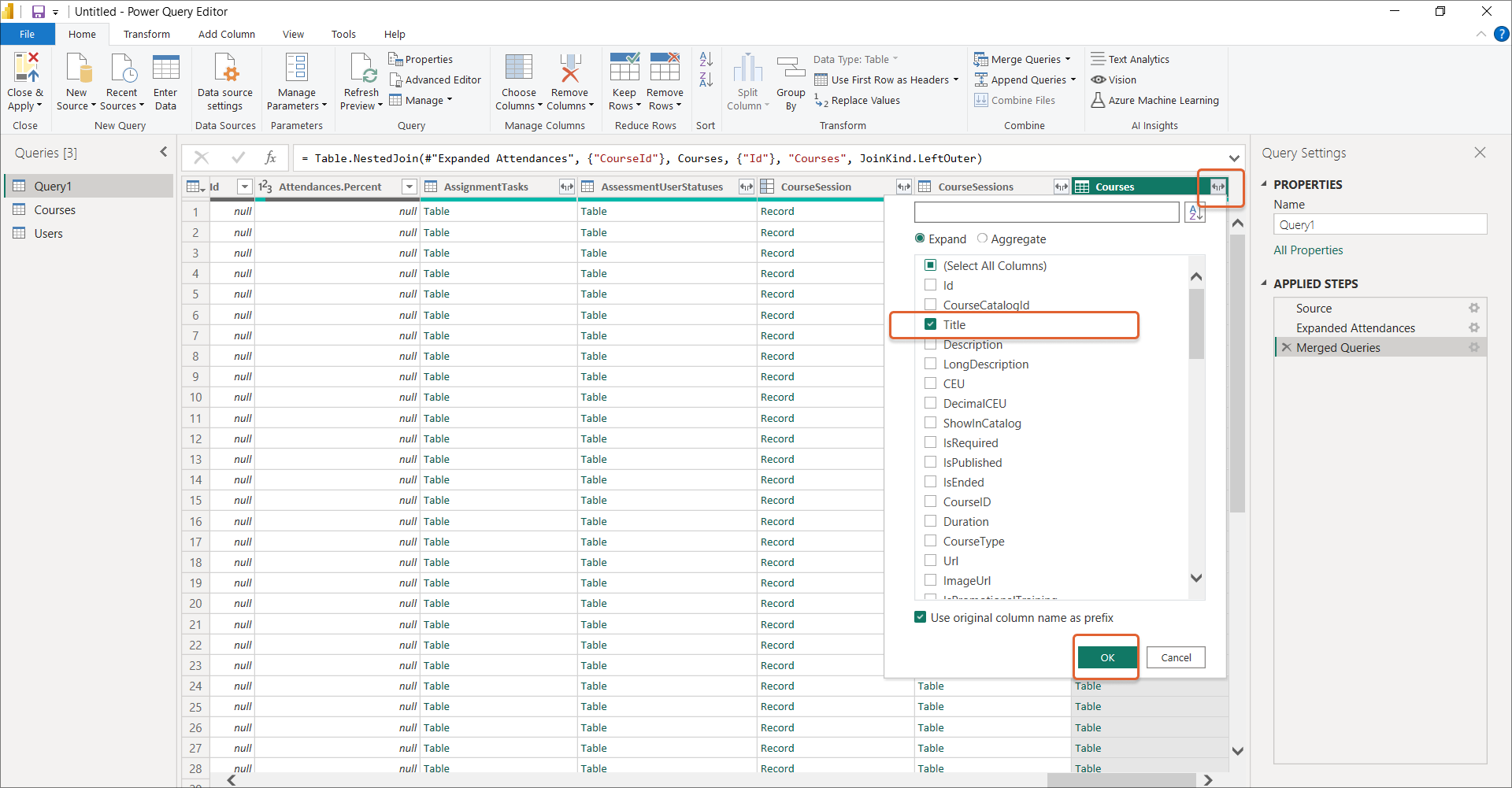 7. In der hinzugefügten Spalte Courses klicken Sie auf das Symbol Erweitern und wählen dann die Spalten aus, die Sie einbeziehen möchten. In diesem Beispiel haben wir nur Title ausgewählt.