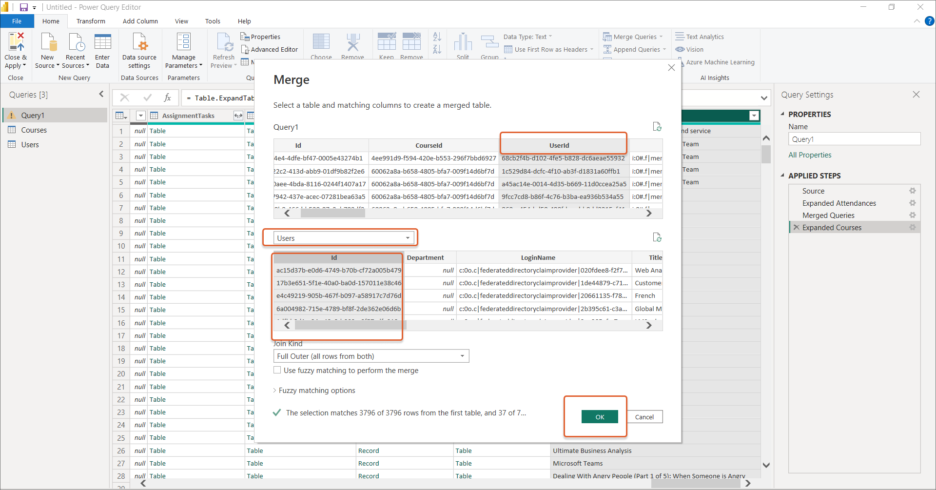 - Wählen Sie im Abschnitt Query1 die Tabelle UserId aus (die Spalte namens UserId).