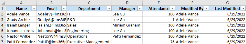 Name. Zeigt die Namen der Benutzer an, die für die Sitzung für Kurse der Typen Einzelregistrierung und Mehrfachregistrierung registriert sind. Für Kurse des Registrierungstyps Alle zeigt das Feld Name die Namen der Benutzer an, die für den Kurs registriert sind.