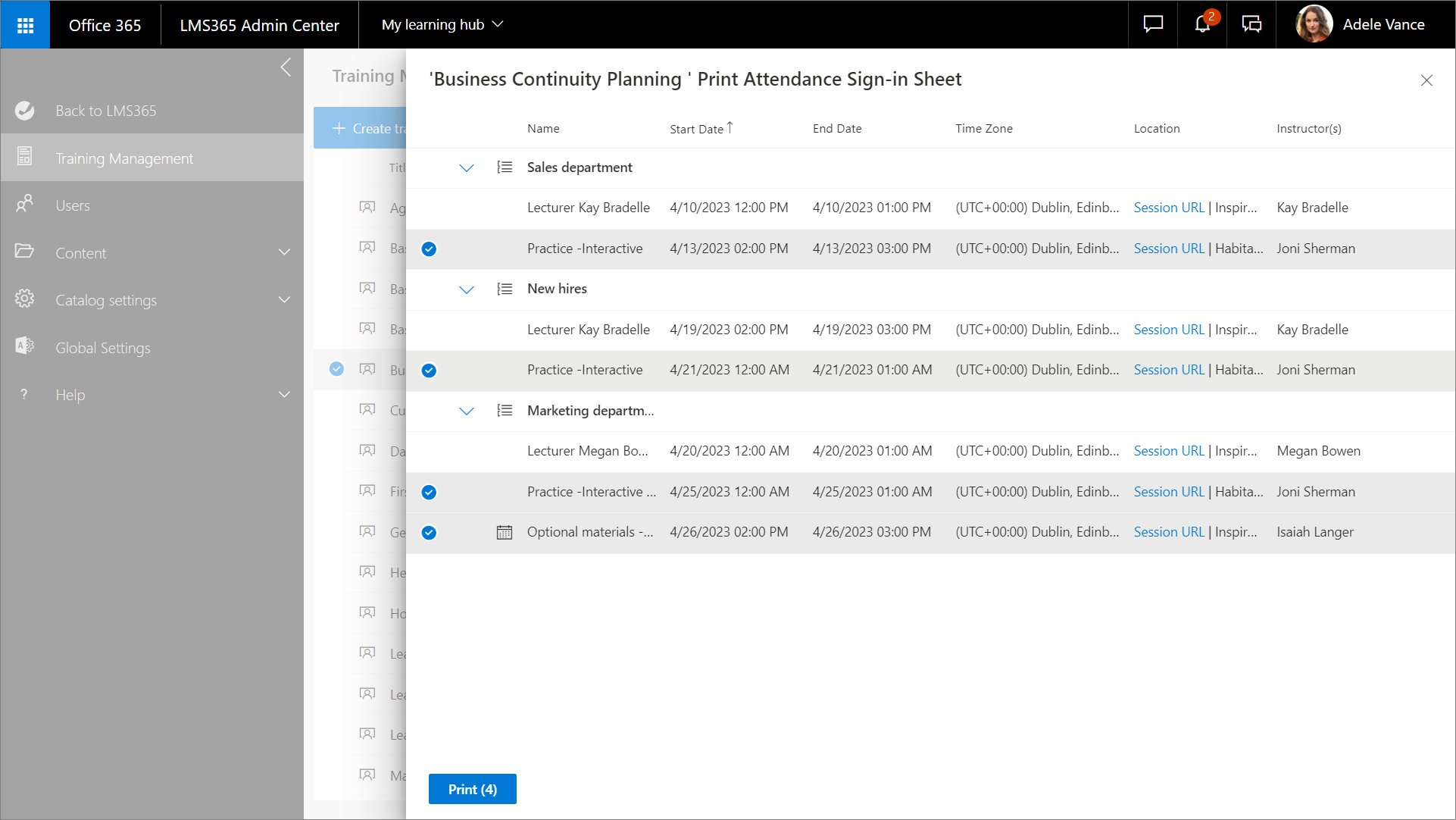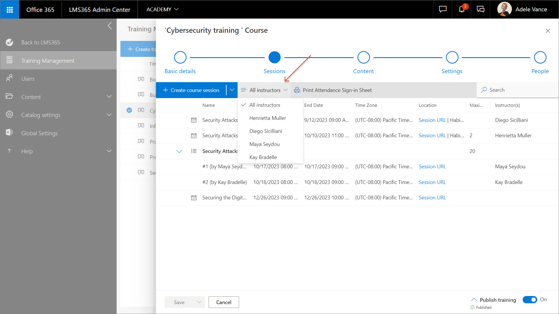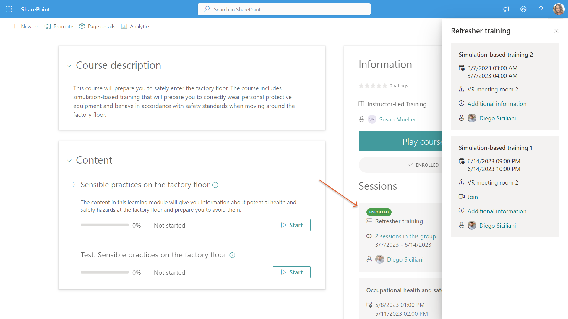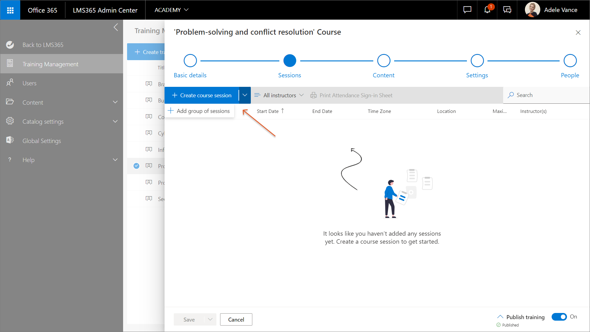 Sitzungen und Sitzungsgruppen können beim Erstellen oder Bearbeiten eines Kurses zu einer veranstaltungsbasierten Schulung hinzugefügt werden.